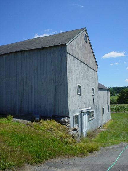Barn-I: This is a multi-unit barn complex comprising of a 1 ½- story five-bay eave-entry bank barn with a gable-roof addition towards the west on its south eave-side and a shed-roof addition on its east gable-end. The south side-wall of the shed-roof addition on the east gable-end of the barn has another shed-roof addition overlapping the south eave-side of the main barn. The five-bay north eave-side of the barn facing the road is the main façade with the main entrance centered in the middle bay through a pair of exterior-hung double-height X-braced sliding wagon doors. The façade has a second entrance in the first bay from the east through a pair of exterior-hung X-braced hooded sliding wagon doors with a hinged hay door positioned above it. The grade level along the north eave-façade of the barn drops towards the west to form the bank along the west gable-end and the south eave-side. The loose earth along the drop line is retained by field stone masonry foundation. The west gable-end of the barn has an entrance at the bank level off-centered towards the north through an exterior-hung hooded sliding pass-through door flanked by a square window towards its north and a multi-pane window towards the south. The first floor level of the west gable-end has two six-pane windows with the gable attic separated by a distinct dropped girt siding divide line. The gable attic is lined by fascia board and has a similar six-pane window just below the apex of the roof. The west eave-side of the gable-roof addition on the south eave-side of the main barn is flush with the west gable-end at the bank level and has a six-pane window towards the north and a square window opening towards the south. A hinged hay door can be seen on the west eave-side of the gable-roof addition centered above the window opening towards the south. The south gable-end of the gable-roof addition has two window openings and a similar window opening centered in the gable attic. The bank level of the south eave-side of the barn has an entrance towards the east through an exterior-hung sliding pass-through door flanked by a square window opening towards the west. Another square window can be seen centered above the pass-through door while few other windows can be seen towards the west. The south side-wall of the shed-roof addition on the east gable-end of the barn is flush with the south eave-side of the main barn. The south eave-side of the shed-roof addition on the south side-wall overlaps the south eave-side of the main barn with its eave-level lined by projecting rafter tails.