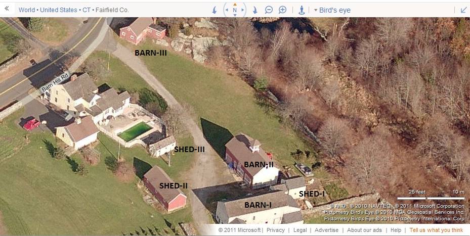 The circa 1799 colonial main residence of the property is almost centered along the northern edge of the property abutting to Barn Hill Road while multi-unit barn complex and the sheds area scattered towards its south and the east. The barn complex comprises of an eave-entry bank barn complex, Barn-I towards the south with its ridge line running east-west parallel to the road. An eave-entry shed gable-roof shed, Shed-I, with a gable-roof addition on its west gable-end is located towards the immediate northeast of Barn-I. The ridge line of Shed-I also runs east-west with the southwest edge of its gable-roof addition on the west gable-end abutting to the northeast edge of Barn-I. An eave-entry barn with the cupola, Barn-II is located towards the northeast of Barn-II while an eave-entry gable-roof shed, Shed-II is located towards the northwest, opposite to Barn-II. The ridge lines of both Barn-II and Shed-II run north-south parallel to each other but perpendicular to the road. The complex includes a third eave-entry barn, Barn-III located towards the northeast of Barn-II with its ridge line running almost north-south. Shed-III is located towards the northeast of Shed-II with its ridge line running east-west. A 1 ½- story garage is located towards the immediate west of the main residence while a pool is positioned towards the south. The property is accessed by a driveway towards the east of the main residence that continues south to Shelton Road dividing the plot longitudinally, with the edges of the two halves demarcated by stone masonry boundary wall. The property has farm land with active agriculture towards the south of the building complex.