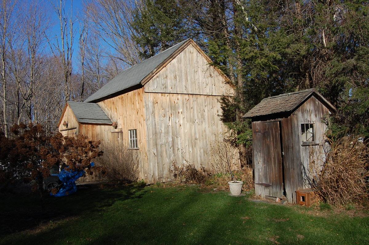 The wooden frame of the barn has asphalt shingle roofing and recently done vertical siding.