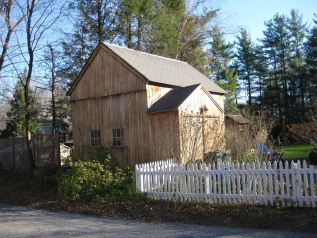 A 1 – story small eave-entry gable-roof shed is located towards the south of the main barn with its ridge line running north-south, perpendicular to Church Street. The west eave-side of the shed is the main façade with the main entrance at the center through a hinged pass-through door with blacksmith hardware. The south gable-end of the shed has a six-pane window off-centered towards the west with trim at the sill-level. The wooden frame of the shed has asphalt shingle roofing and vertical siding walls.