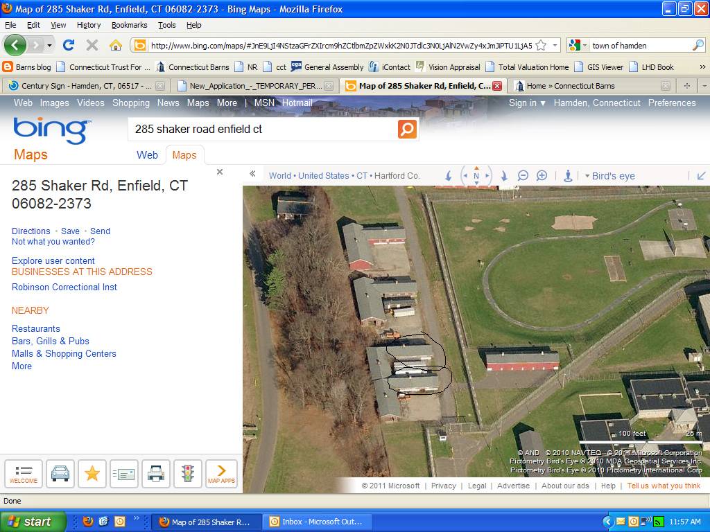 The attached bing shot is of a portion of two 20 century barns L's that collapsed in the winter, located at 285 Shaker road in Enfield. Robinson Correctional Institute http://www.ct.gov/doc/cwp/view.asp?a=1499&q=265444 The Robinson Correctional Institution was opened on November 8, 1985. It is situated on the site of an historic Shaker farm community, which dates from 1792. Enfield CT Shakers: http://www.nps.gov/nr/travel/shaker/ect.htm Enfield Shakers Historic District ** (added 1979 - Hartford County - #79002663) Shaker, Taylor and Cybulski Rds. , Enfield (1100 acres, 15 buildings) Historic Significance: Event, Architecture/Engineering Area of Significance: Architecture, Agriculture, Social History, Religion Period of Significance: 1850-1874, 1825-1849 Owner: State , Private Historic Function: Agriculture/Subsistence, Religion Historic Sub-function: Agricultural Outbuildings, Church Related Residence, Religious Structure Current Function: Domestic Needs work - determine other agricultural buildings to be included.