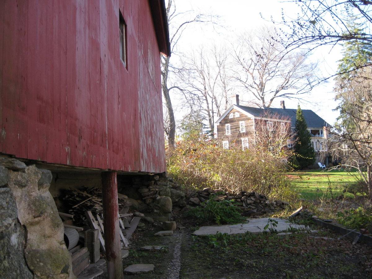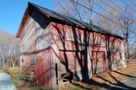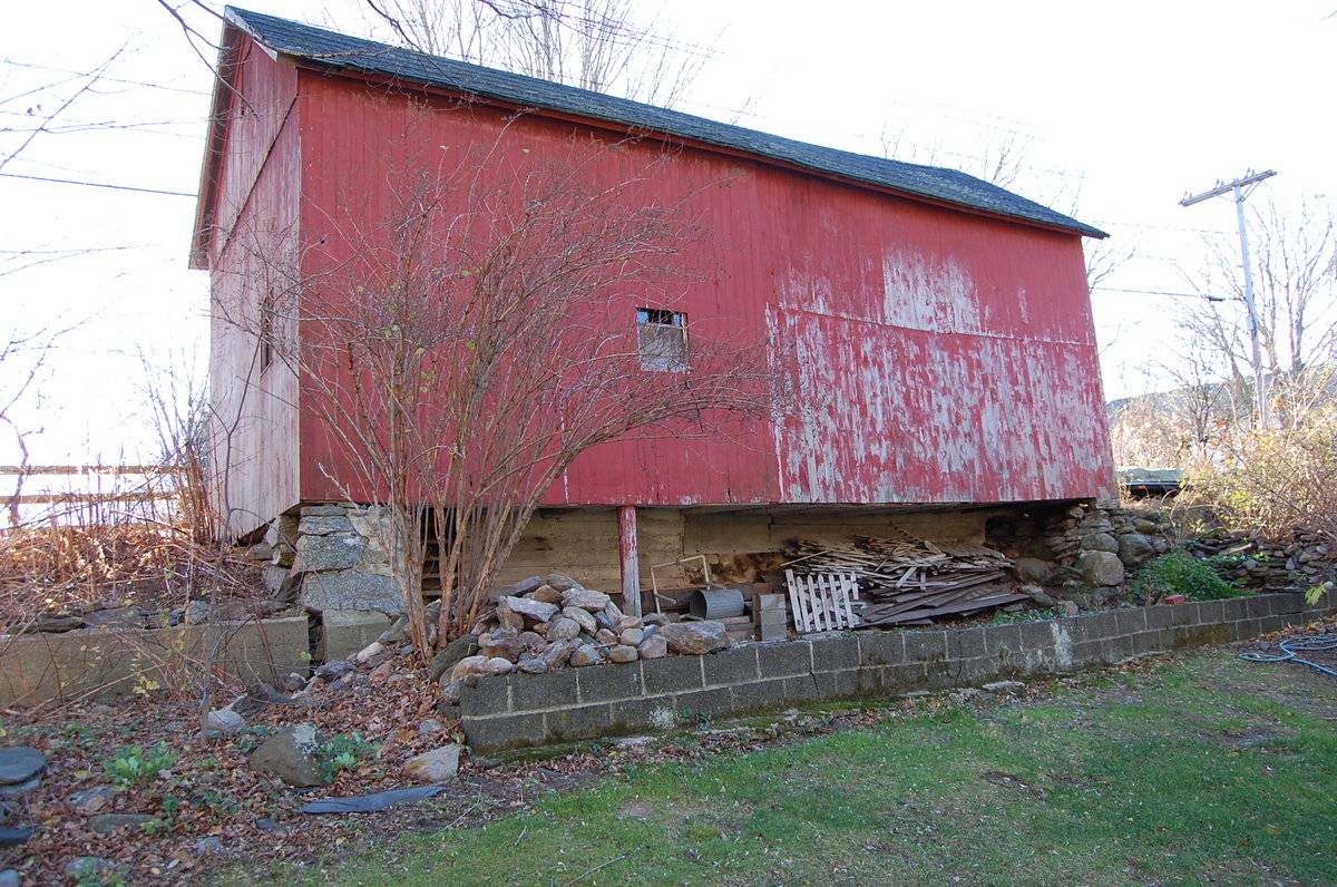 This is a 1 1/2- story three-bay eave-entry barn towards the north of Old Tannery Road. The ridge line of the barn runs east-west parallel to this portion of the road. The three-bay south eave-side of the barn facing the road is the main façade with two main entrance through two over-head garage doors; one each in the first and the second bays from the west. The façade has an external-hung sliding hay door centered above each over-head garage-door. The original main entrance to the barn may have been through a double-height wagon door entrance as evident from a trim below the two hay doors. The façade has a third entrance which is the first bay from the east through an external-hung sliding pass-through door with a hinged hay-door centered above it. Two windows can be seen towards the east of this pass-through sliding door. The west gable-end of the barn has an entrance off-centered towards the south through a hinged pass-through door with a boarded window towards its north. The vertical siding towards the north on the west gable-end has a circular opening while the gable attic is lined by deep soffit. The north eave-side of the barn has a lower grade level revealing the field stone masonry and supporting wooden posts of the barn. The low grade level allows half-height clearance to access the area beneath the barn and may have been used as a bank level. The grade level along the east gable-end gradually rises towards the north along the field stone masonry foundation of the barn. The east gable-end of the barn has a window off-centered towards the south at the first floor level with the gable attic separated by s distinct dropped girt siding divide line. The gable attic lined by deep soffit has a window just below the apex of the roof.