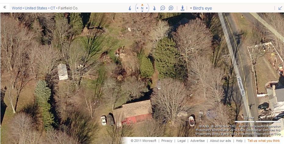 The barn is located towards the southern edge of the property with its ridge line running east-west, almost perpendicular to this portion of Wheeler Road. The pre- 1775 saltbox style main residence is located towards the northeast of the barn, abutting to the road. A gable-roof outbuilding with its ridge line running north-south is located towards the northwest of the barn. The property has a garden surrounding the main residence while woodland can be seen towards the edges.