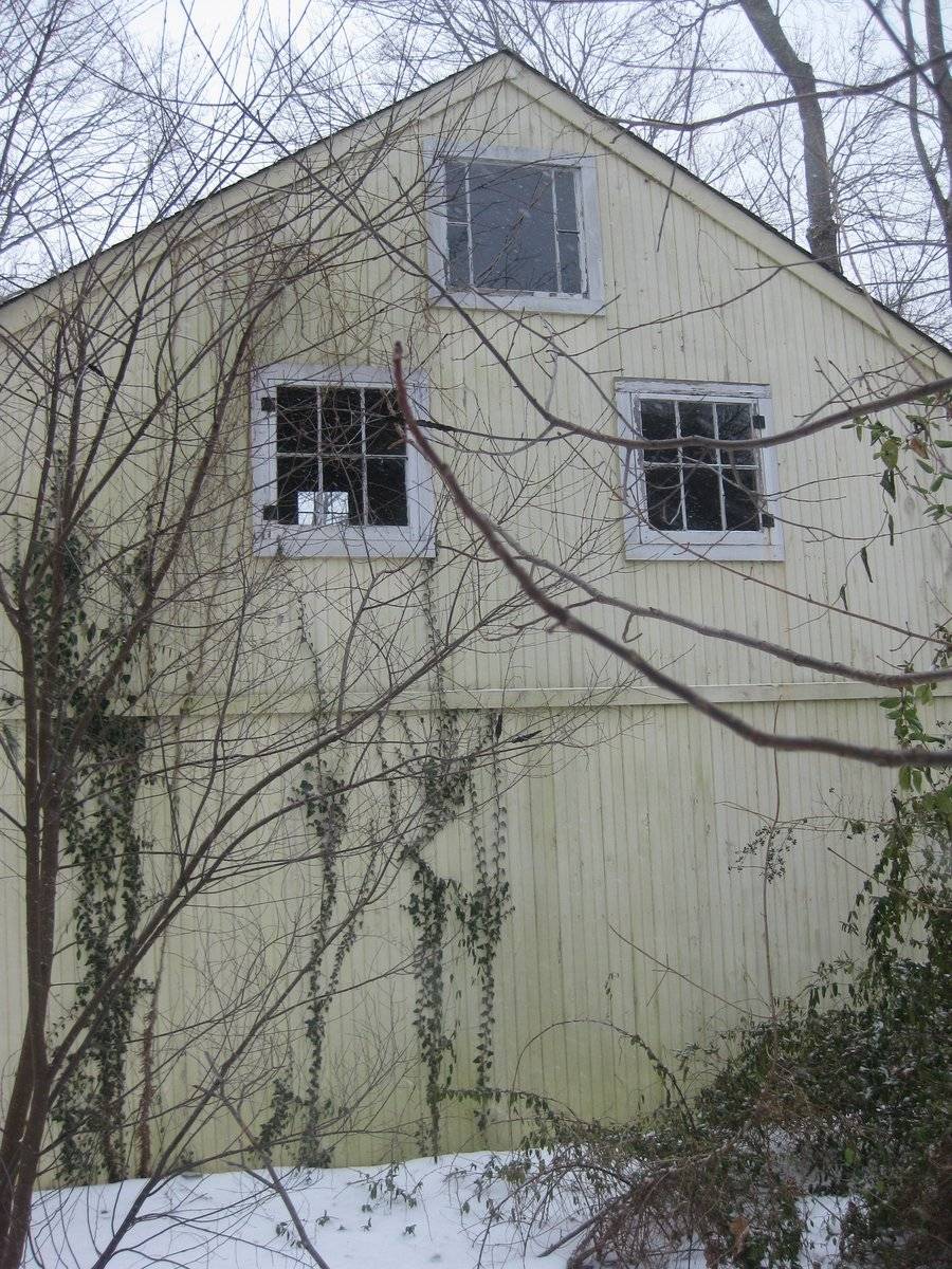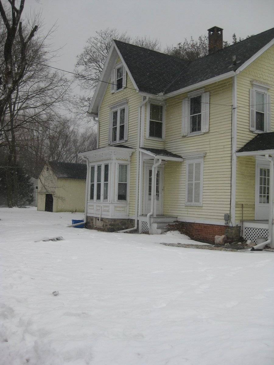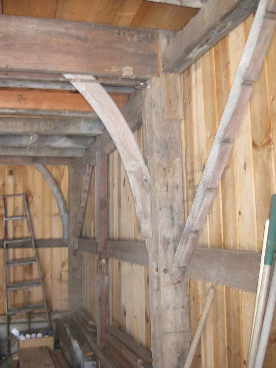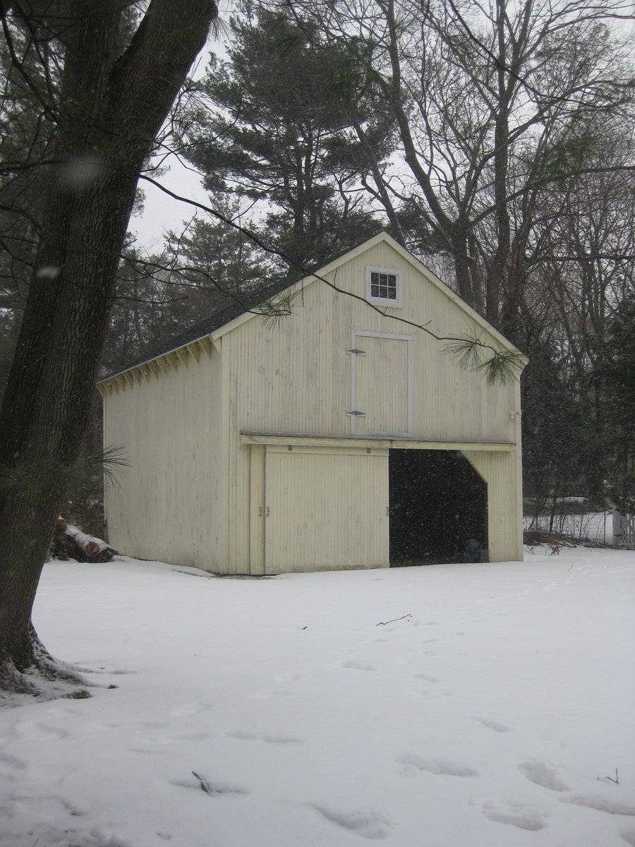 The yellow, 2 story barn is an unknown type measuring approximately 22 ft. across the front and 28 ft. long (625 sq. ft. according to town records). It is covered in tongue and groove vertical siding, asphalt shingles on the roof, and the gable end presents to the side street. The barn seems associated with the Victorian style 1899 home on the property. The framing is post and beam, open inside, and accessed through sliding doors on the street gable end that are almost as wide as the barn. A hayloft door is centered above the sliding doors and is approximately 4-5 ft. high and 3 ft. wide with heavy hinges on the left side. What appear to be undecorated brackets are on both sides under the eaves. They do not replicate the downward line of the roof but form a triangle between the underside of the eave line and the plane of the façade so may be structural. The structure has no windows on the sides, but a small 3 over 3 window at the gable peak end toward the street. The back side has 3 windows, placed in a triangular pattern on the 2nd floor level. The two lower windows are set widely with 3 over 3 panes and heavy hinges on the left and right side, respectively, so that might swing out. The third window is the same size, positioned at the peak of the gable, but appears fixed with a central pane and 2 sidelights. Inside, framing includes braces that appear mortised into both corner and wall posts and then into the tie beams and girts. Some braces are curved and heavier, some are straight and thinner. From the inside all framing is exposed and the tongue and groove siding appears to be forming a sheath outside that framing. The sills cannot readily be seen. At present it appears to be used as a household garage and for storage.