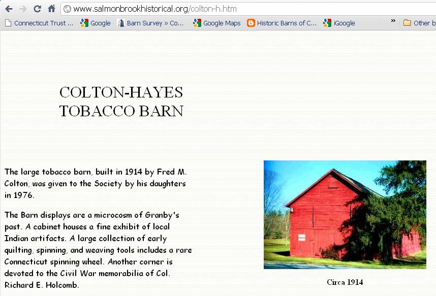 Granby Historical Society collection of buildings includes Colton-Hayes Tobacco Shed. http://www.salmonbrookhistorical.org/