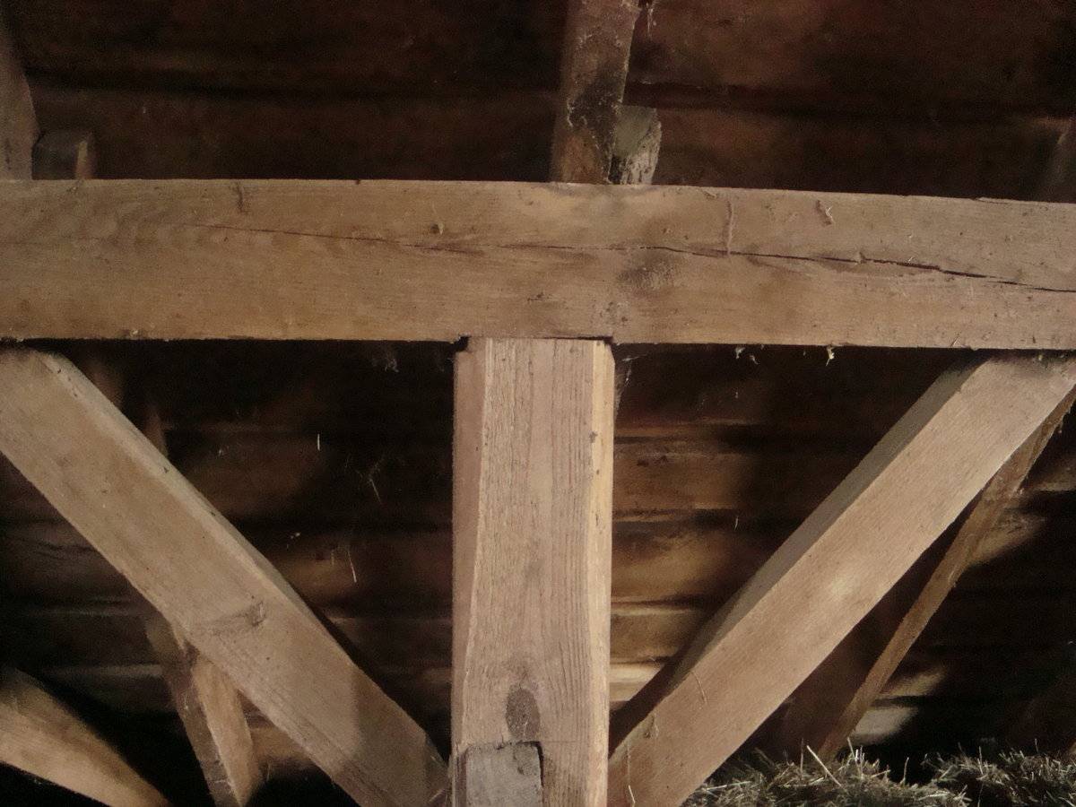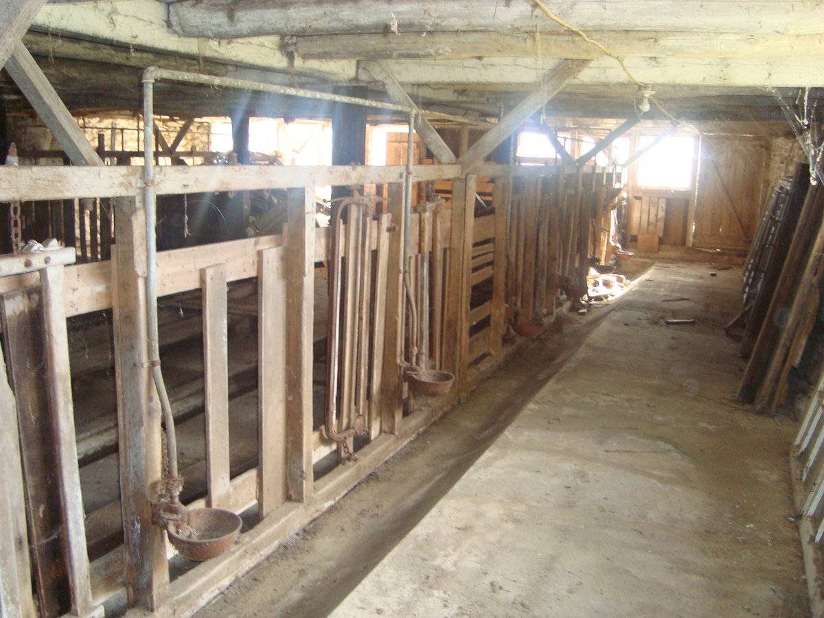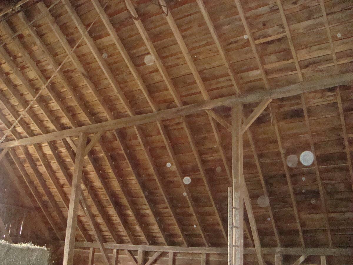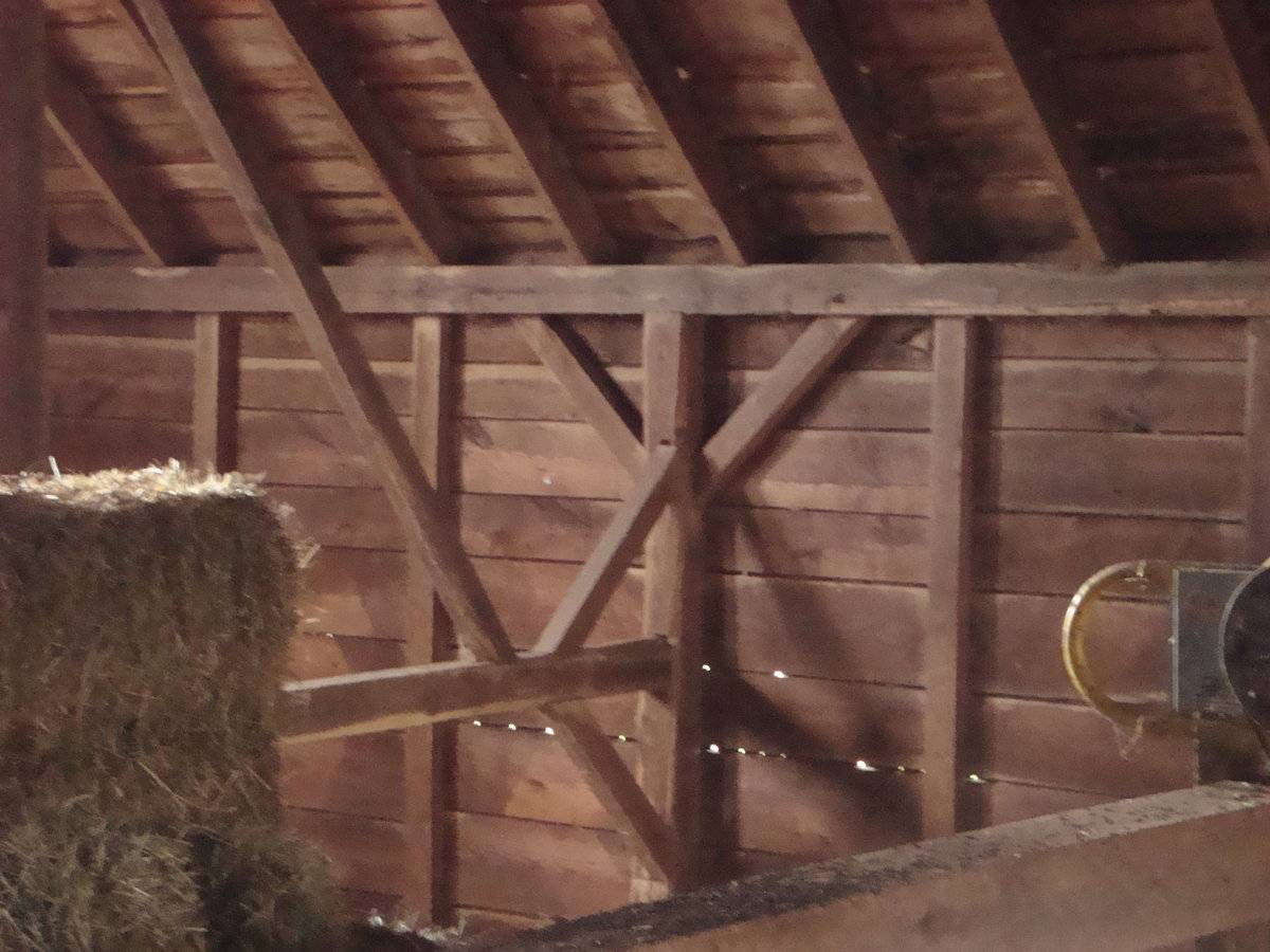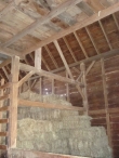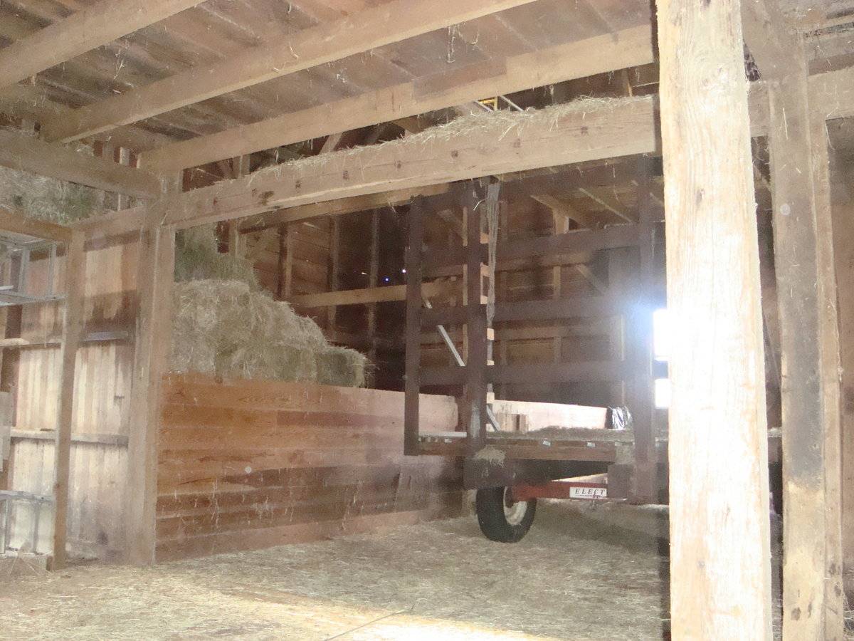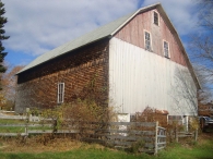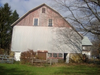 Directly below the eave in the center of the north eave-side of the gable-roof addition appears to be either a loft-door or a window opening that is now covered with a decorative wood panel. On the south eave-side of the gable-roof addition are two bays that appear to contain large overhead garage doors. On the southern half of the west eave-side of the original barn appears to be a stable window with trim.