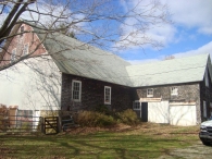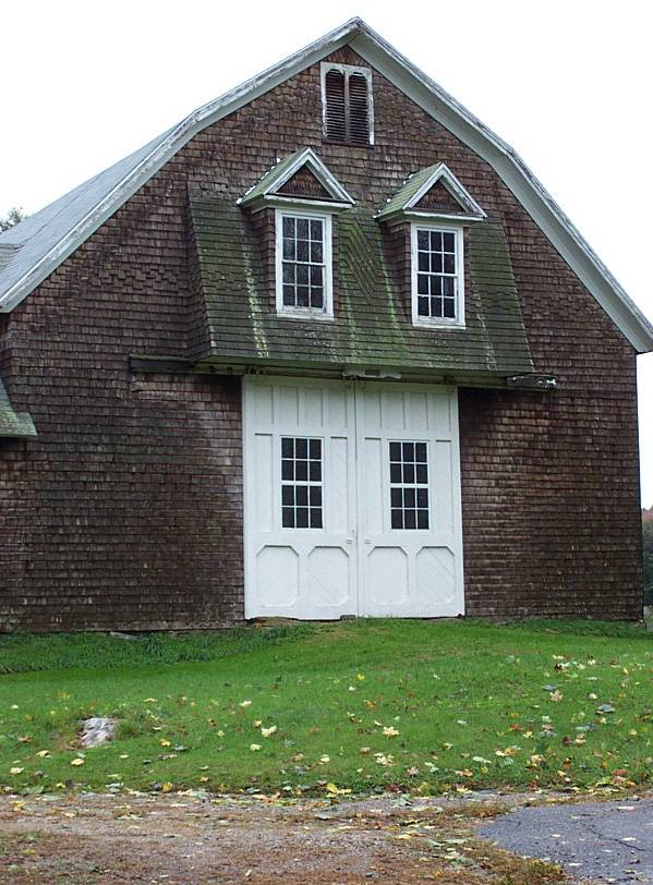 The exterior walls of the barn are covered with stained wood shingles. The roof is covered with asphalt shingles. The foundation is constructed of mortared fieldstone.