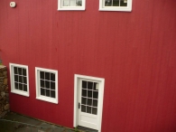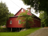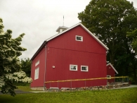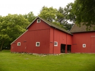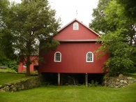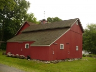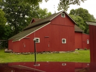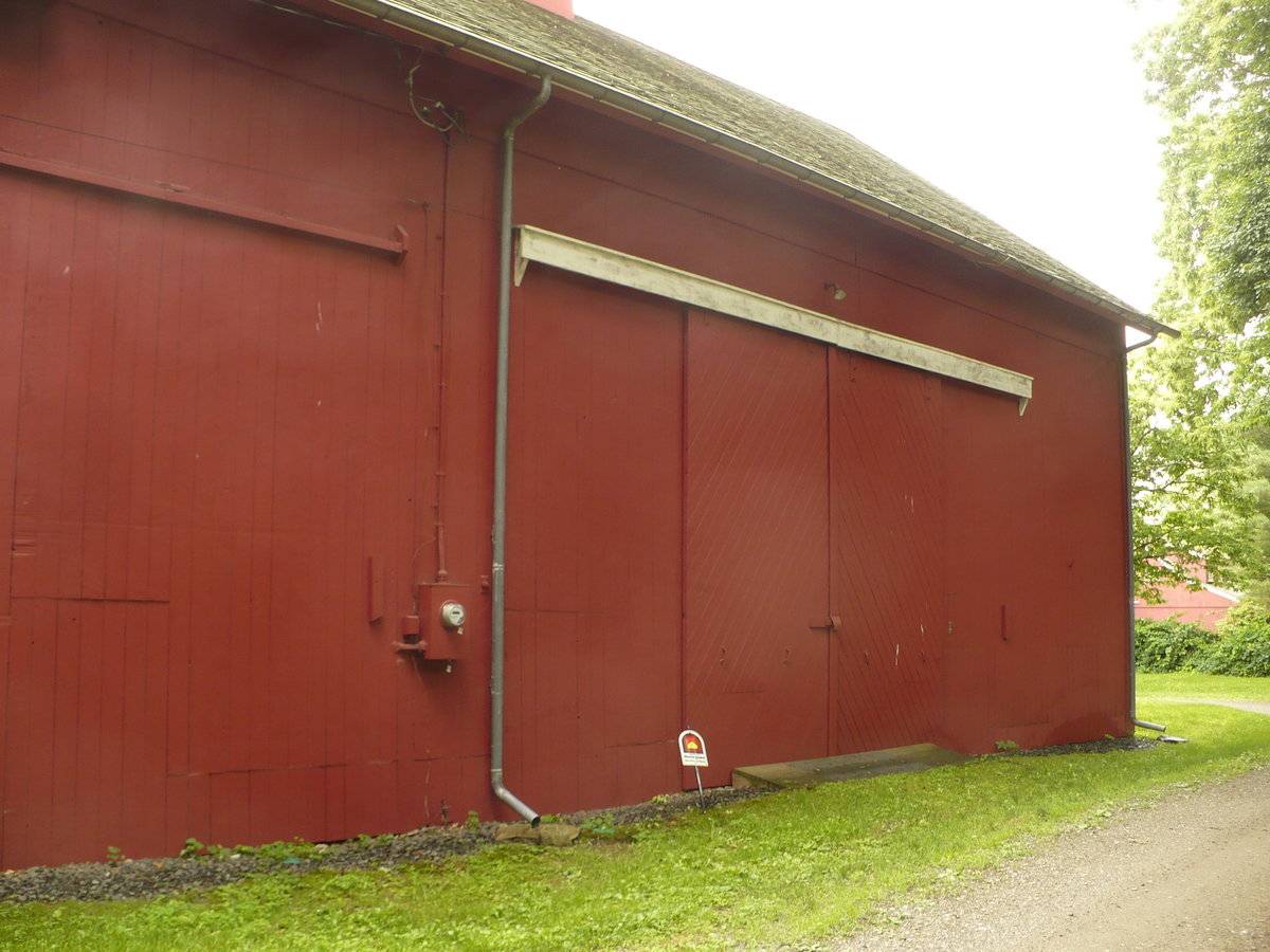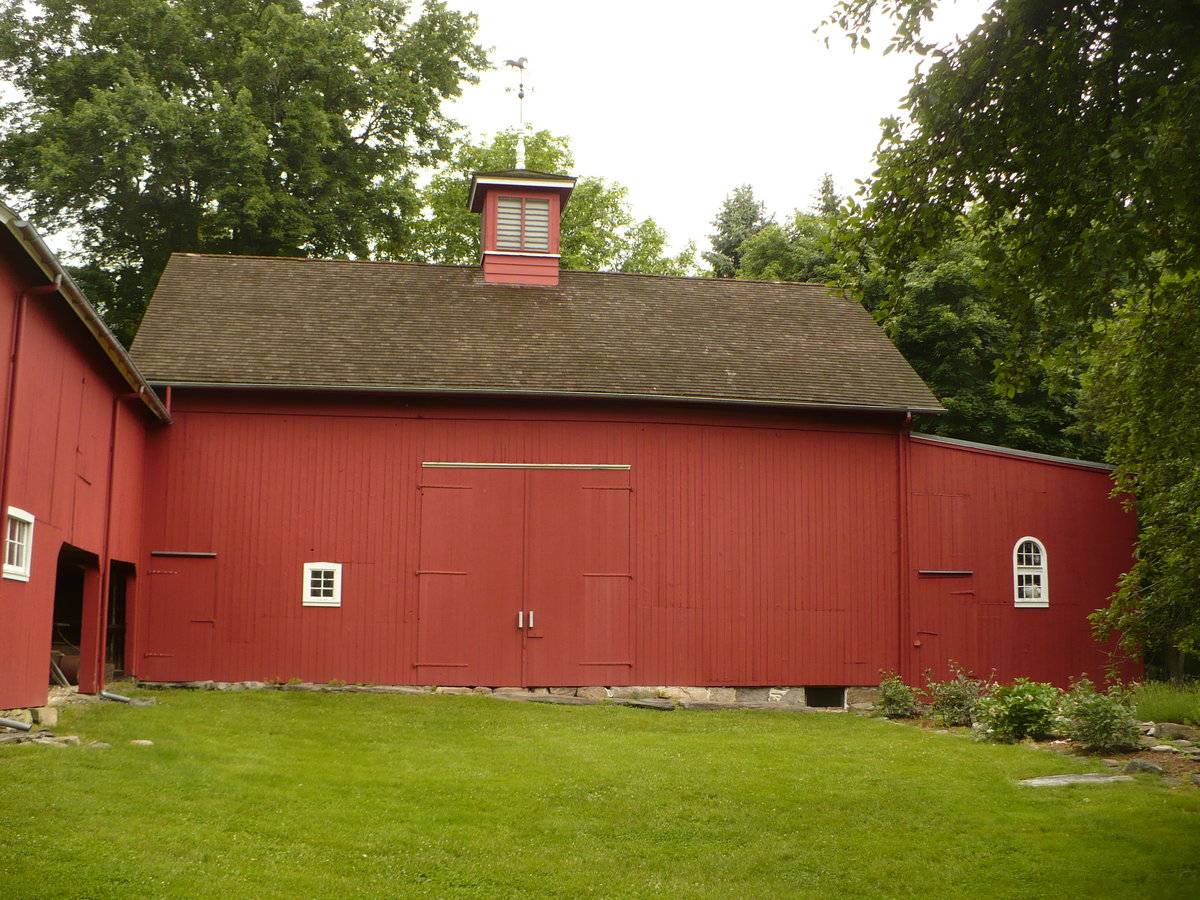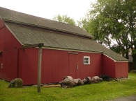 The main entry is centered on the west gable-façade of the barn and consists of a pair of double-height, side-hinged doors with original iron strap hinges. A pass-through paneled door with a twelve-pane window in the top half is on the north corner of the west gable-façade. Just above the girt line siding divide is a six-over-six double-hung window. The gable consists of a Greek-Revival cornice return. Attached to the south eave-side of the barn is a shed-roof addition which encompasses the entire south side of the barn. The grade drops along the south side of the barn, revealing a full basement level on the addition and the east gable-end of the barn. A stone retaining wall extends to the south off the east corner on the south side of the shed-roof addition.