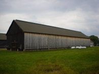 The tobacco barn, or shed as it is called in the Connecticut River Valley, is one of the most distinctive of the single-crop barns. They tend to be long, low windowless buildings with pitched roofs. They are characterized by vented sides to regulate air flow and allow harvested tobacco to cure at the appropriate rate. Derived initially from the design of the English barn, the shed is composed of a fixed skeleton consisting of two- or three-aisle bents repeated at intervals of 15 feet to the desired length. The wood-framed bents sit on piers of stone or concrete and the bents are connected by girts and diagonal braces. Typically there are two doors at each end, making the shed a “drive-through,” although some sheds are accessed through doors on the sides. The interior structural framework serves a second purpose in addition to supporting the walls and roof of the building; it provides a framework for the rails used to hang the tobacco as it cures.