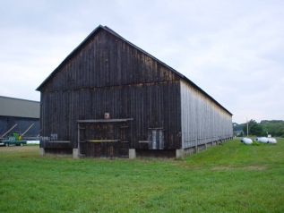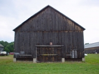Cluster-A: This includes the three 1 ½ - story three-aisle eleven-bent tobacco sheds located in the north-east corner of the property with Shed-AI towards the north and Shed-AII towards the south. The third tobacco shed, Shed-AIII is staggered towards the south-west of Shed-AI. The ridge lines of the three tobacco sheds run east-west perpendicular to East Road with their east gable-sides facing the road. The main west gable-facades of the three tobacco sheds are oriented away from the road with the main entrances at the center through a pair of hinged wagon doors with blacksmith hardware. The gable attics of the main west gable-facades are separated from the rest of the façade by a distinct girt siding divide line and have two side-pivot awning windows towards the eaves and another similar side-pivot awning window just below the apex of the roof. The tobacco sheds are ventilated through the vertical siding on the eave-sides where every second board is hinged at the top and tilted out at the bottom by means of a horizontal cleat, that lifts many boards at once, and metal prop hooks to hold the boards in place. Additional ventilation of the roof is also provided through a continuous ridge vent.