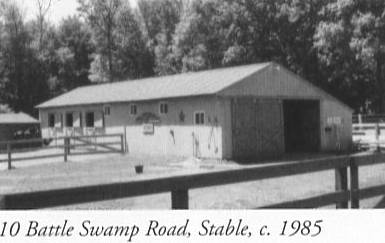 This is a good example of a pole barn with the framing uprights (dimensional millwork posts) are mounted directly into the ground. The stable is one of a pair of horse barns located off a driveway leading northwest off Battle Swamp Road. The drive passes to the northeast of the barns and continues north to a log house on an elevated site overlooking barns and paddock. Features include: 50 x 20; low, rectangular peak-roofed barn standing with its gable ends to east and west, northward sloping roof line; exterior-mount rolling doors, east gable end; three divided stall doors at southwest corner; pre-fabricated trusses; center-aisle layout with flanking horse stalls; dirt floor; grey stain.
