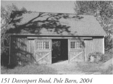 This pole barn was built by Amish barn builders from Pennsylvania. The barn is located on the south side of Davenport Road, to the rear and south of the house. It is a lightly wooded area in an otherwise open setting. Features include: 36 x 24; peak-roofed barn stands with gable ends oriented to the north and south; primary elevation faces west; symmetrical composition with central rolling doors on exterior mounts; multi-pane sash above panels with cross stiles; loft doors located in north gable end; double rolling doors on exterior mounts, cross stiles; pair of 6-over-6 double-hung sash set below; concrete floor; wooden box stalls and feeds; board & batten.