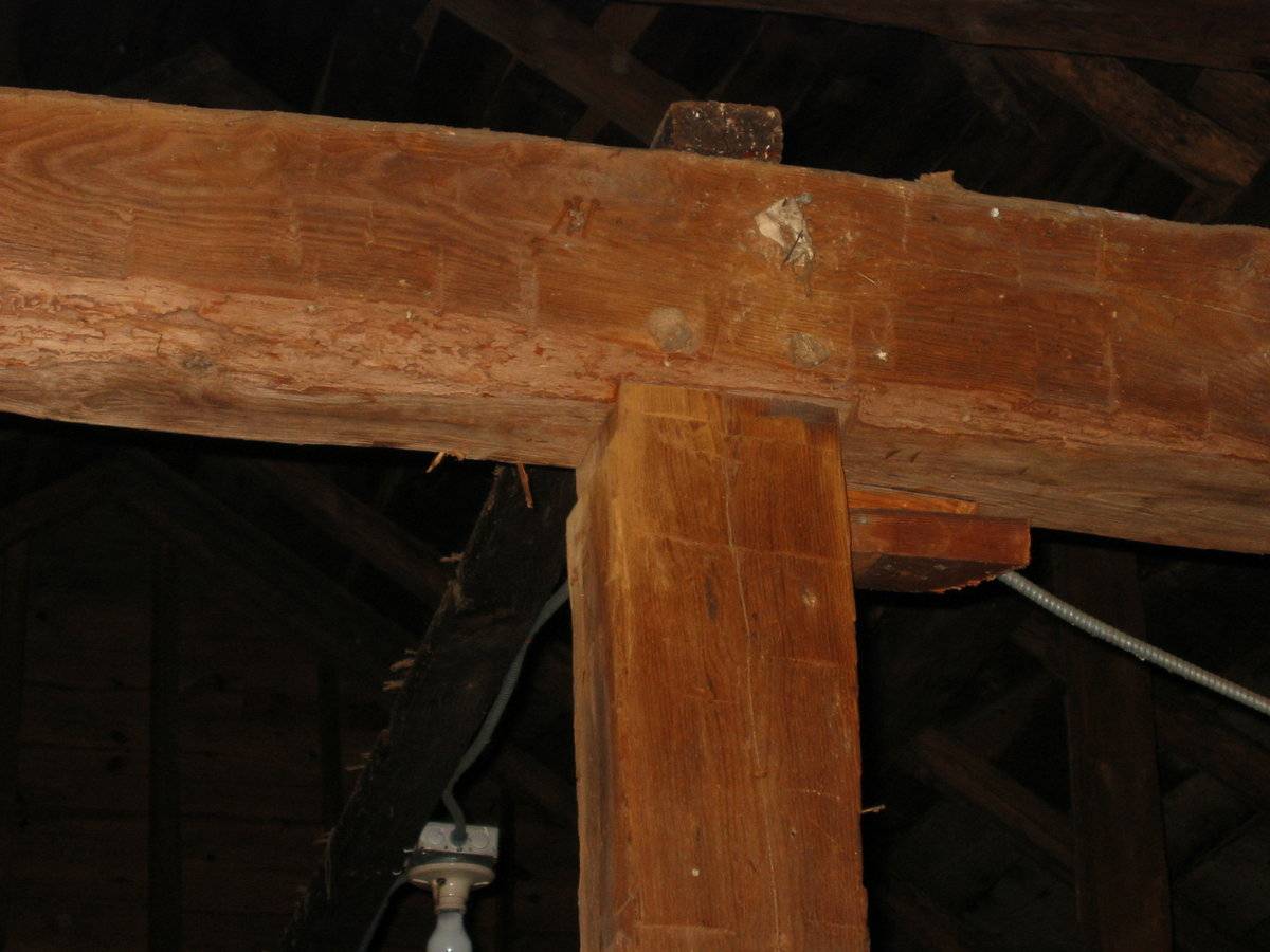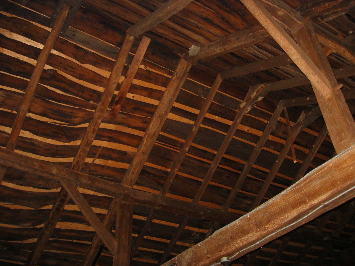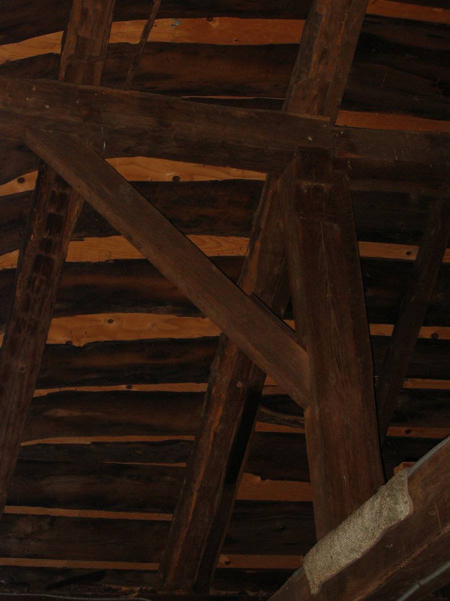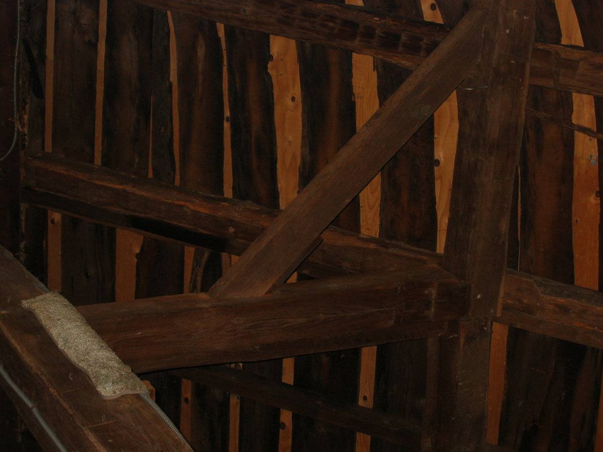 This extended English bank barn is constructed with a hewn and sawn, sqsuare-rule frame with dropped ties and arcade plates. Evidence of the added bay can be seen in the sistering of major timbers and the discontinuous plates.