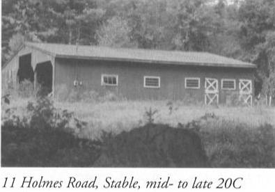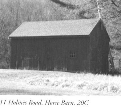 This barn was probably built in the second half of the 20th century, but its trim lines and simple profile evoke a traditional form and it contributes to the landscape. The barn stands on the west side of Holmes Road, to the north of the c. 1770 house. A larger horse barn is located to the northeast. It is fronted by lawn and wooded to the north. Features include: 28 x 16; peak-roofed barn stands with gable ends oriented to the east and west; primary elevation faces south; double (Dutch) door set off-center to the west; single 6-pane window to east; loft door in east gable end; flat-roofed, two-bay wing (open bays) extends north from northwest corner; wood frame; vertical tongue-and-groove barn board; red paint.