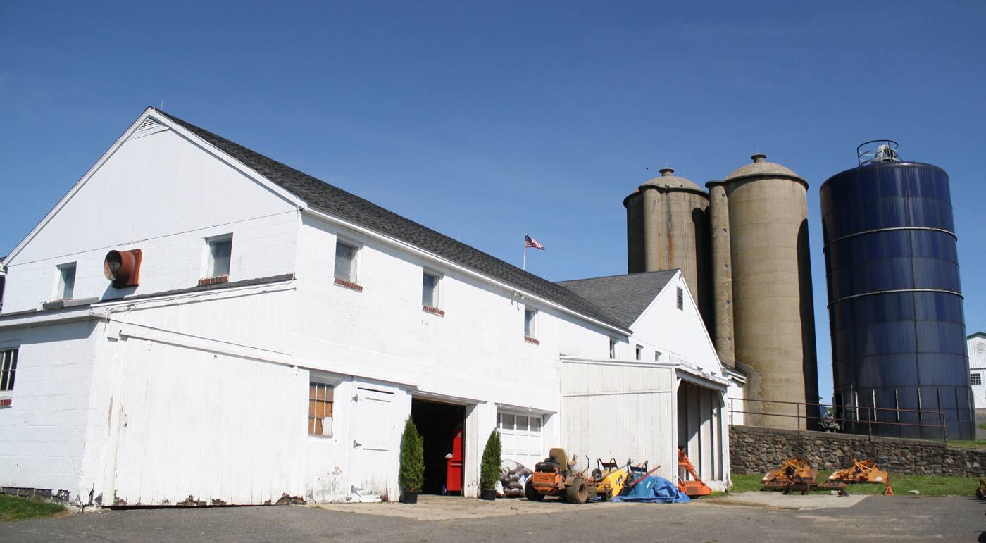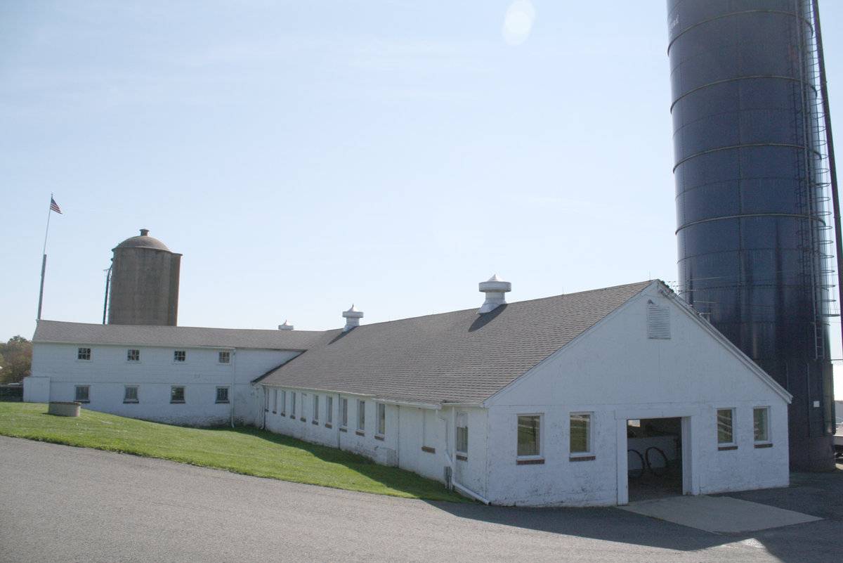 The core of the dairy farm, this large barn, was built by Richard and Dorothy Diebold in 1947 after a previous barn on the site burned down while under construction. The intersecting structure on the east side was the grain room, and the milk room (bulk storage) was located on the west side. The Diebolds milked 56 cows in stanchions in this barn, piping the milk directly into the milk room tank. All the milk was sold wholesale. The building is currently used to store a collection of farm antiques. Two concrete silos and a steel silo are attached. One of the concrete silos survived the 1947 fire and the other was added around 1950. The blue steel silo, originally used for grass silage, dates from the 1980s.