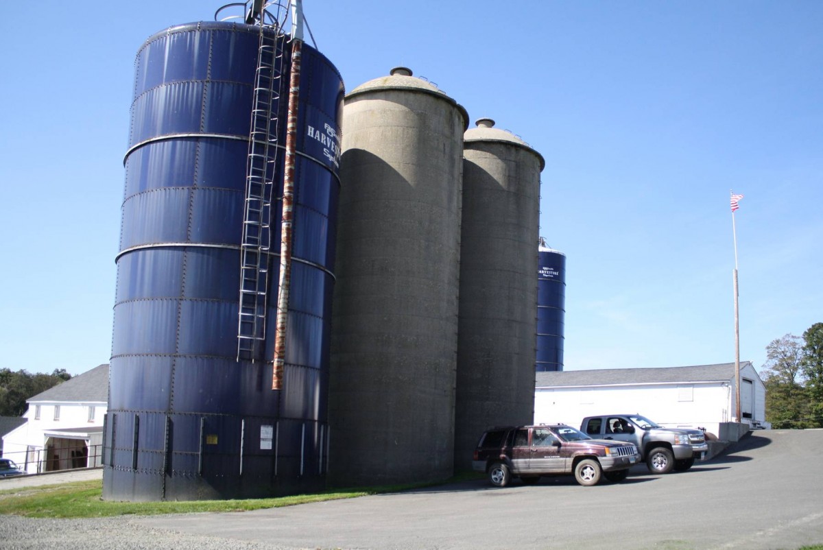 This Harvestore silo, once used to hold corn kernels, is one of four still standing at the main dairy barn (the other three are structurally attached). Known for is blue color, the Harvestore silo is made of vitrified steel plates, impermeable by the acids produced by silage and other feeds. Pressure sacks limit decomposition by inhibiting oxygen leaks. Harvestores were first produced in the 1940s by the S. O. Smith Co. of Milwaukee, Wisconsin. This type of silo is loaded from the top and unloaded from the bottom. The silo stands just to the south of the two concrete silos attached to the former dairy barn. It is part of an extensive grouping of outbuildings located on the south side of Painter Hill Road. The site is mostly open fields. Features include:(no dimensions); riveted silo of blue steel; ladder and blower tube on south side.