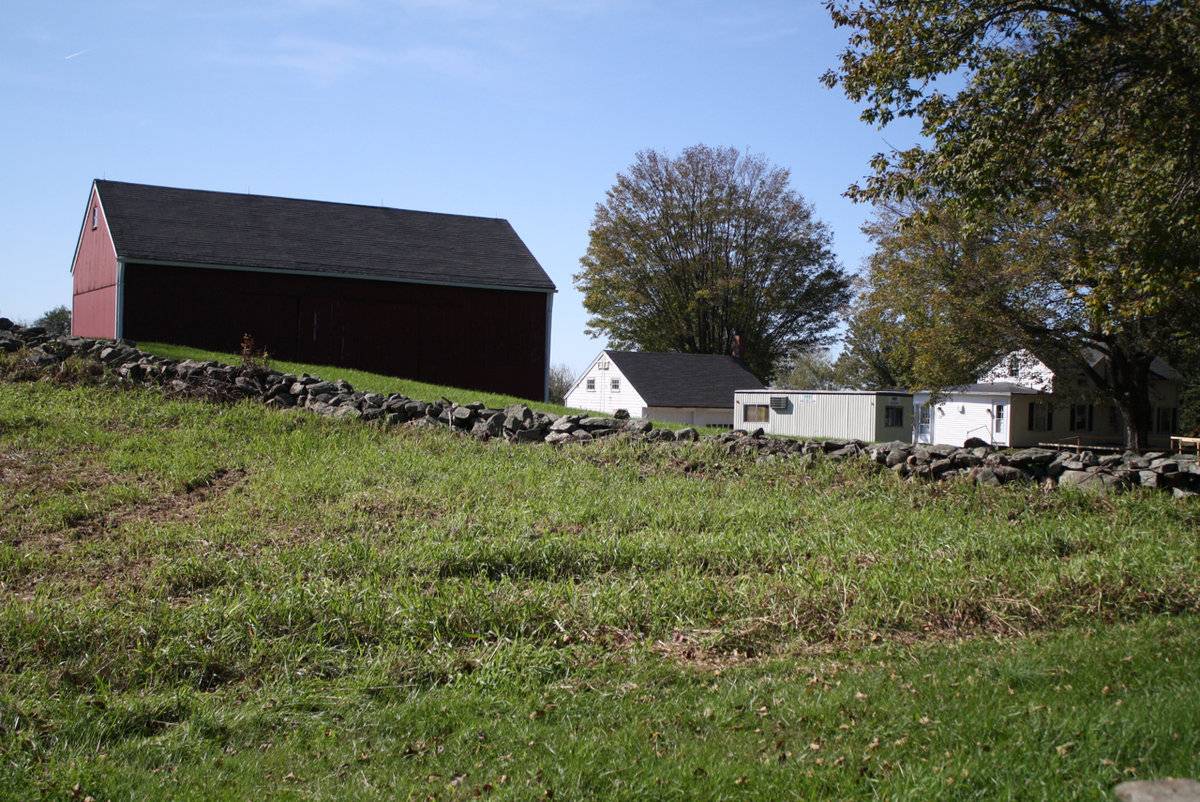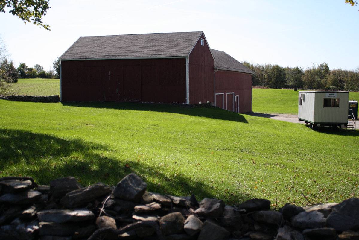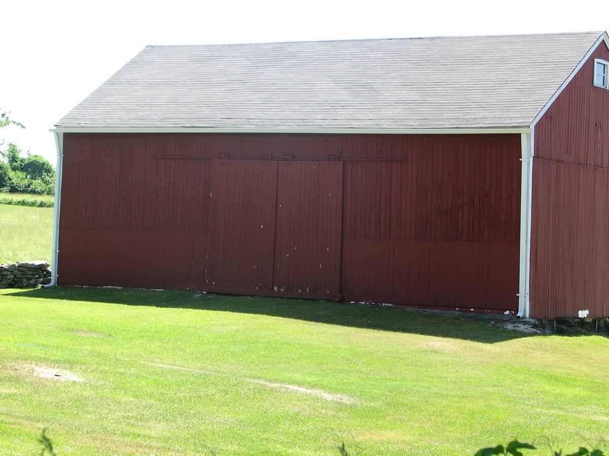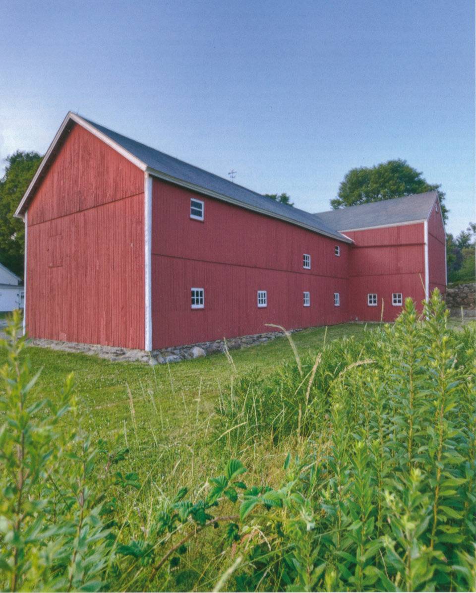 The barn stands on the west side of Gold Mine Road at the intersection of Painter Hill Road. The main house is to the north, the garage is located between the house and barn on the west side of the former barnyard. A drive enters from the west side of Gold Mine Road and passes to the north of the barn. The site is open and grassy. Features include: 36 x 22, 28 x 52; barn consists of two sections: English bank barn stands with gable ends to the north and south; peak-roofed wing extends to the west to form L-plan; English bank barn oriented with primary façade to the east: central rolling doors on exterior mounts; barn is banked to the west so that it gains a lower floor on the west side; fieldstone retaining wall extends to south; fenestration primarily 6-pane tilt windows; red paint. Interior bank barn: hewn post-and-beam frame (square rule), log joists; concrete floor; deep fieldstone foundation east side; whitewashed interior. Interior west wing: milled post-and-beam frame with some hewn joists; plank floor.