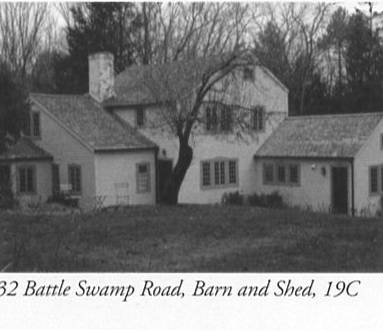 The house, with attached barns, stands on a terraced site on the north side of Battle Swamp Road. Across the road, a ledge drops down to Battle Swamp Brook. Features include: 25 x 29 (main barn section); 11 x 25; 14 x 16 ; 22 x 20 (Saltbox portion); asymmetrically massed structure consists of 1 ½-story saltbox house with three sections added to create rambling profile; screened porch at northwest corner; varied fenestration (new) includes casements and double-hung windows; post-and-beam construction; clapboard.