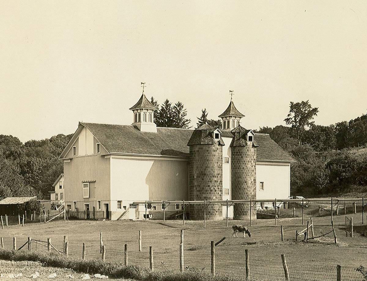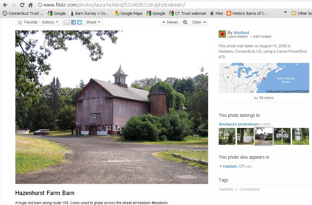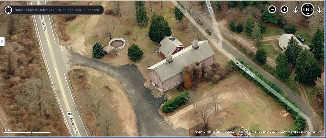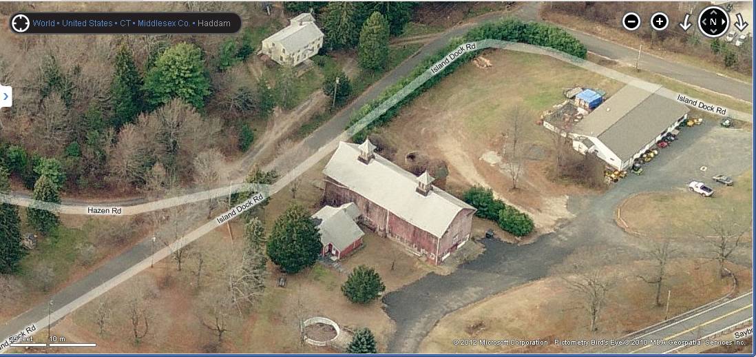 The most magnificent barn in Haddam, the Hazenhurst Dairy Barn sits along the west side of Saybrook Road facing Haddam Meadows State Park. A real estate advertisement from the early 20th century states the building is a "modern" dairy barn fully equipped with milking machines, refrigeration, steam sterilizing outfits and more. Tie ups for 38 cows, 7 calfs and maternity box stalls, one herd sire box stall, and storage fro 200 tons of hay and 60 tons grain overhead. It was purchased by gentleman farmer Edward Hazen in 1913-1915. Records indicate that the barn was built in 1900 although local tradition states that the barn is actually two older barns that were moved together to create this monumental structure. One barn came from the Arnold property just south of the old burying ground. The barn exhibits vertical plank sideing with gable end to street. The massive roof is highlighted by two ornate cupolas which provide ventilation. Two silos were once featured on the north facade and made of cast blocks. Fenestration and entries are found on the ground floor. The building is currently in a state of deterioration. A small house, formerly a dairy building is attached to the southern elevation.