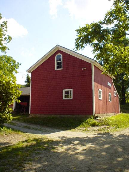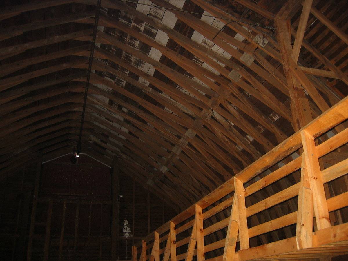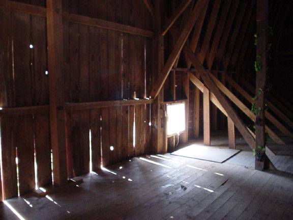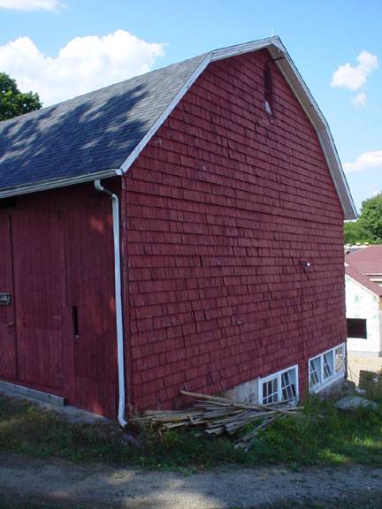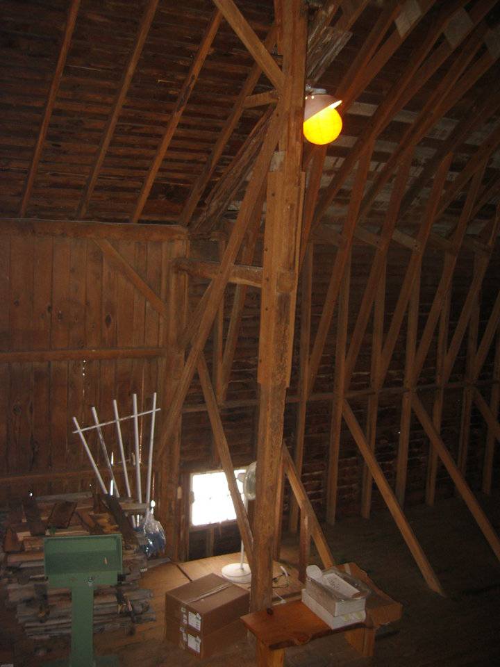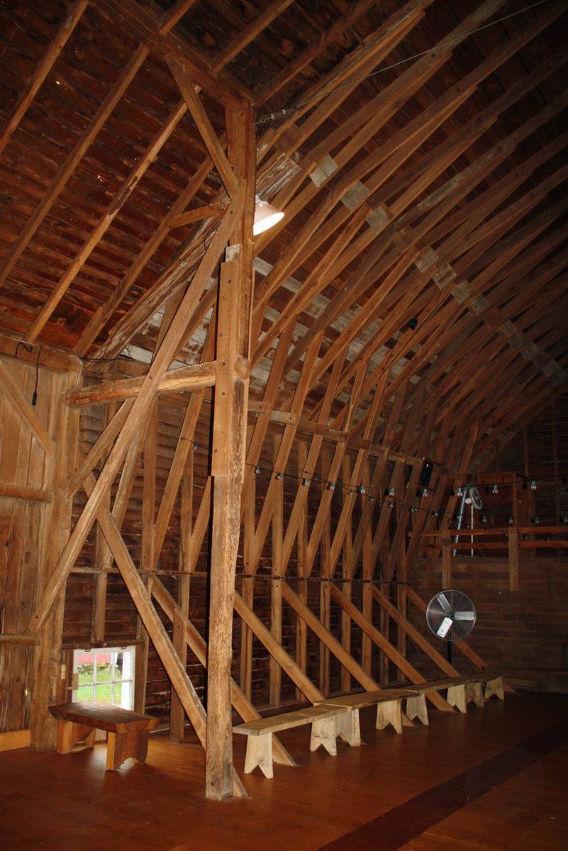 This barn combines an unusual timber-framed gambrel structure with a continuation of the same volume constructed with sawn dimension lumber trusses each forming the vertical wall plane and the gambrel shape, rising from both sides to meet at the ridge-line.