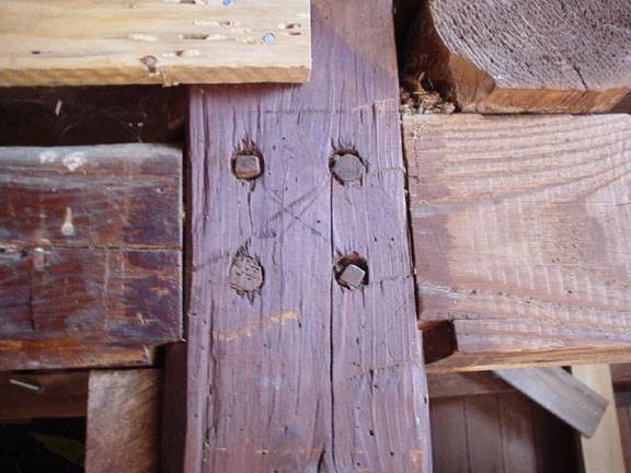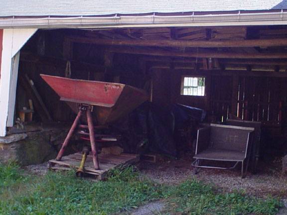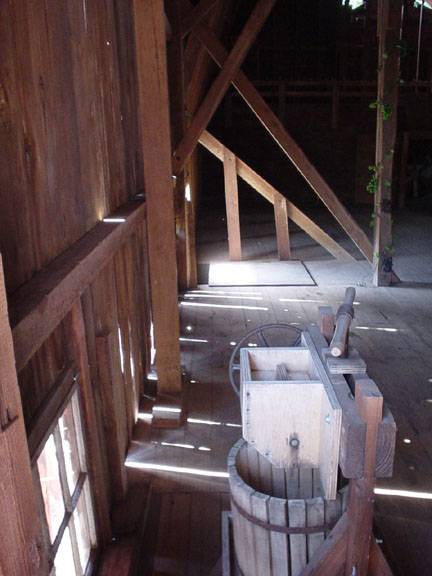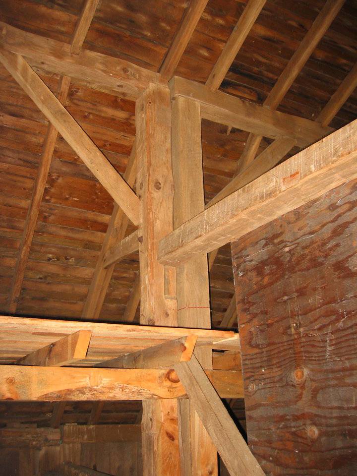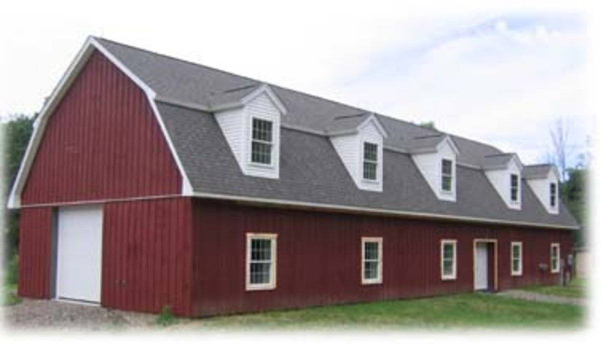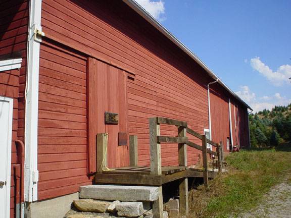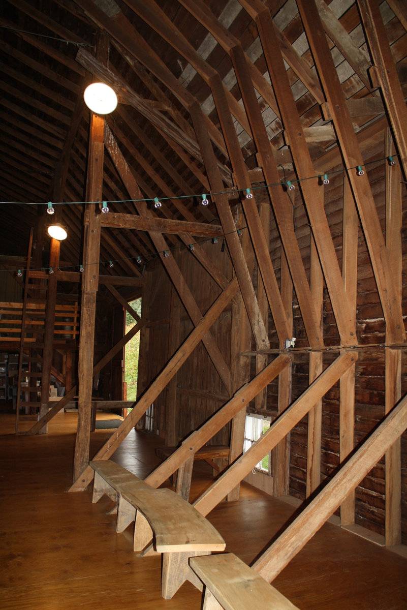 This barn combines an unusual timber-framed gambrel structure with a continuation of the same volume constructed with sawn dimension lumber trusses each forming the vertical wall plane and the gambrel shape, rising from both sides to meet at the ridge-line.