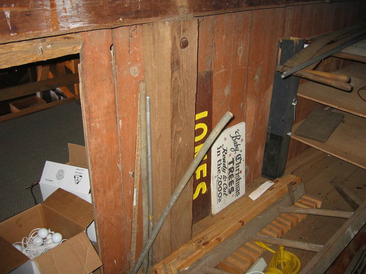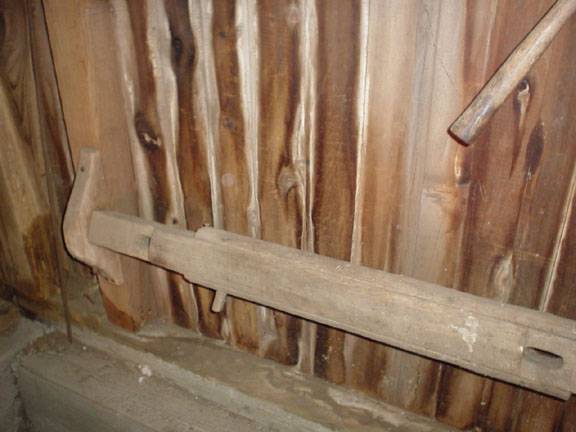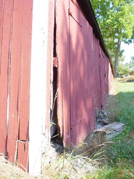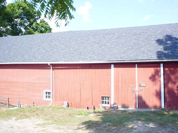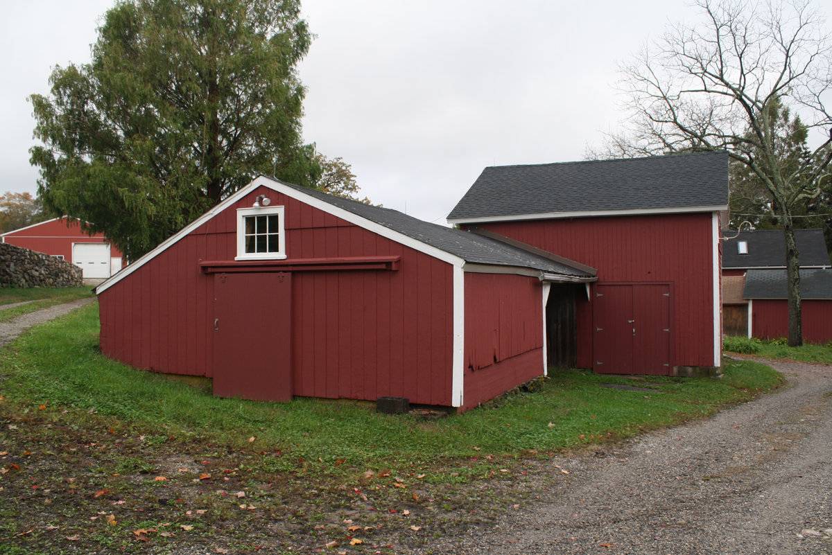 The south eave-side, from right (east) to left, has as the end bay an addition built circa 1910, with a pair of tall hinged barn doors opening out. To the left is a three-bay English barn structure, which was the earliest to be built. It has a pair of sliding barn doors in the center bay; there is a hinged weather door in the left leaf. The next bay toward the left has a six-pane stable-type window located just above the floor level at the right edge of the bay. Vertical siding sheathes these four bays, which are constructed with post and beam timber framing. Further to the left, there is an addition approximately 30 feet long aligned with the walls and roof of the first section, but constructed with the 20th-century balloon framing technique. Siding on this portion is wood horizontal lap siding.