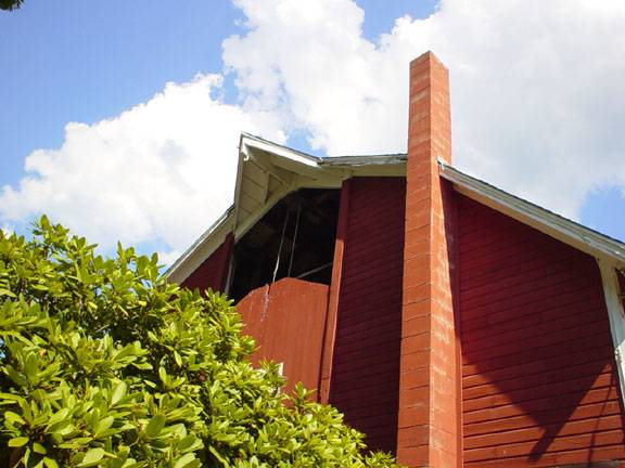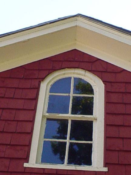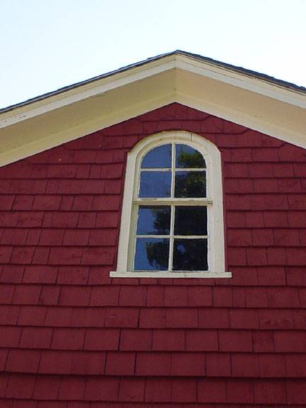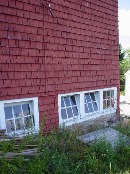 The east gable-end has a grade sloping up toward the south and a stepped concrete foundation visible at the left (south) corner. Toward the right (north) are two window openings, formerly containing a pair and a triple panel of six-pane stable windows. Following renovation, these are two pairs of large awning windows. Below the eave line, a slight change of plane indicates a dropped girt line.