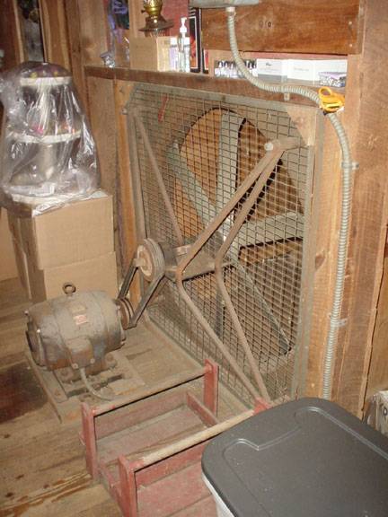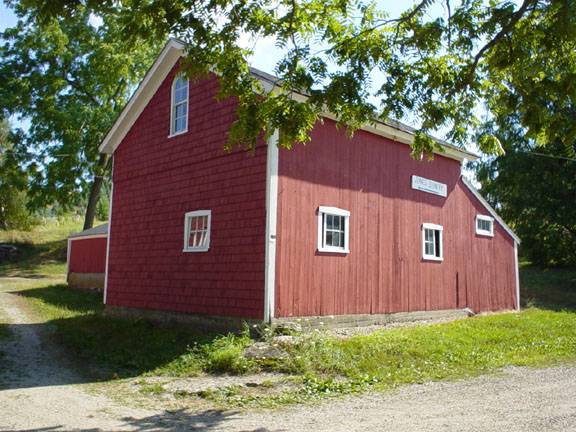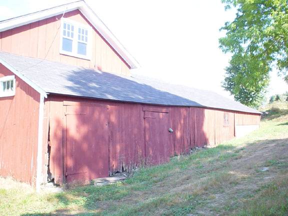 The west gable-end of the main structure is the end wall of the balloon-framed structure and has a projecting hay hood at the roof line. A large vertical lift door gives access to the hay mow. Siding is horizontal lap siding. The grade slopes down along the gable-end and a 1-story concrete block masonry milk room addition with a shed roof is attached at the west gable-end aligning with the north wall. This has three double hung windows in the west eave-side wall (new replacement sash). A small shed-roofed addition aligns with the south wall and opens a few steps below the main level elevation. It has shingle siding, a pass-through door in its south side, and there is a concrete masonry chimney rising through the shed roof and abutting the upper gable-end wall to terminate above the roof line.