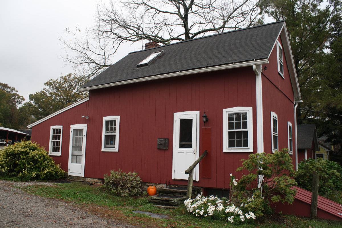 The north eave-side prior to 2008 had a basement ground-level stable area for cows and horses, converted to a gift shop space. Near the left (east) end was an overhead door, to its right a row of four six-pane stable windows, then a six-over-six double hung window, a pair of pass-through doors, then 12 six-over-six double hung windows and at the right corner a pass-through door. In the wall of the main level, there is a two-pane stable-type window near the center of the timber-framed portion and at the extreme right corner a similar window. The ground level has been renovated to create a wine tasting room. The left (east) portion has a series of steel and glass overhead doors opening to a trellised stone patio. At the center is a pair of glass entry doors and to the right a long horizontal projected bay window forms a vitrine for display. Siding is wood shingles.