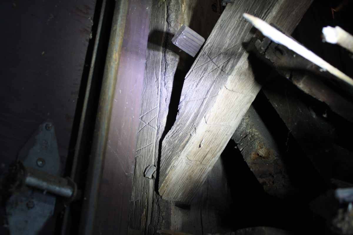 Stage two was constructed by extending the length another 36’ at the gable end and keeping the width at 24’. This produced a barn 24’ wide by 72’ long. Where the two structures are joined, there are double posts so each is framed independently of the other. All the other dimensions are the same as stage one- roof pitch, eaves height, peak- so from the exterior it looks like one long barn. Stage two must have been built soon after stage one because the framing methods and components are so similar. It was certainly added before the end of the 18th century and probably by 1760.