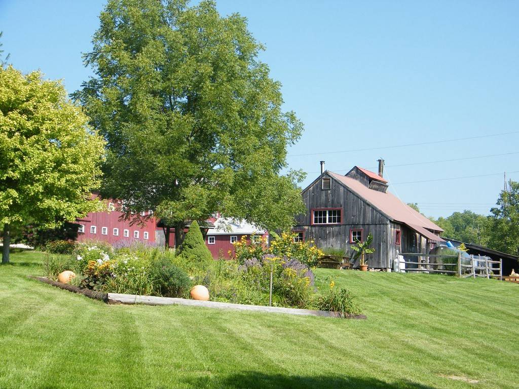 The core structure, a three-bay English bank barn, has its main entry doors in the center bay of the west eave-side facing the road. The main doors are a pair of tall single sliding doors hung on an exterior track with a shallow hood, both sliding to the left (north). A shorter sliding door is in the right (south) bay, with the modern farm stand located inside this bay. To the right (south) is the horse barn extension, which has a row of four-pane stable windows in the ground level. Above at the loft level there are four-pane windows, and a hay door.