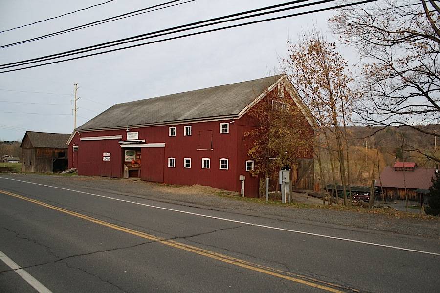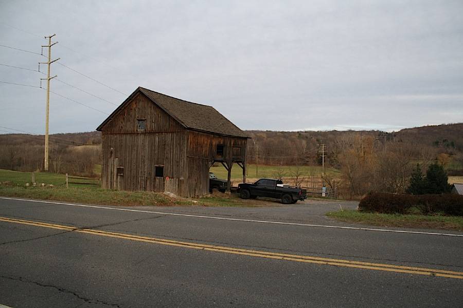 The main barn consists of a central core and a number of additions. The core structure is a 30’ x 52’ English bank barn dating from c. 1869. Its ridge-line is oriented north-south parallel to the road, and the barn is located close to the edge of the modern roadway (when constructed, it was a narrower dirt road). The barn was extended southward another 30’ c. 1900 for a horse barn addition which continues the same roofline. The east side was later expanded for a wider basement dairy stable, a connector was built to join the tobacco barn to the main structure, and a small bull barn addition was added to the east end of the tobacco barn. Siding throughout is vertical flush boards painted red with white trim. Windows are trimmed with beveled lintel and casings. Roofing is asphalt shingles.