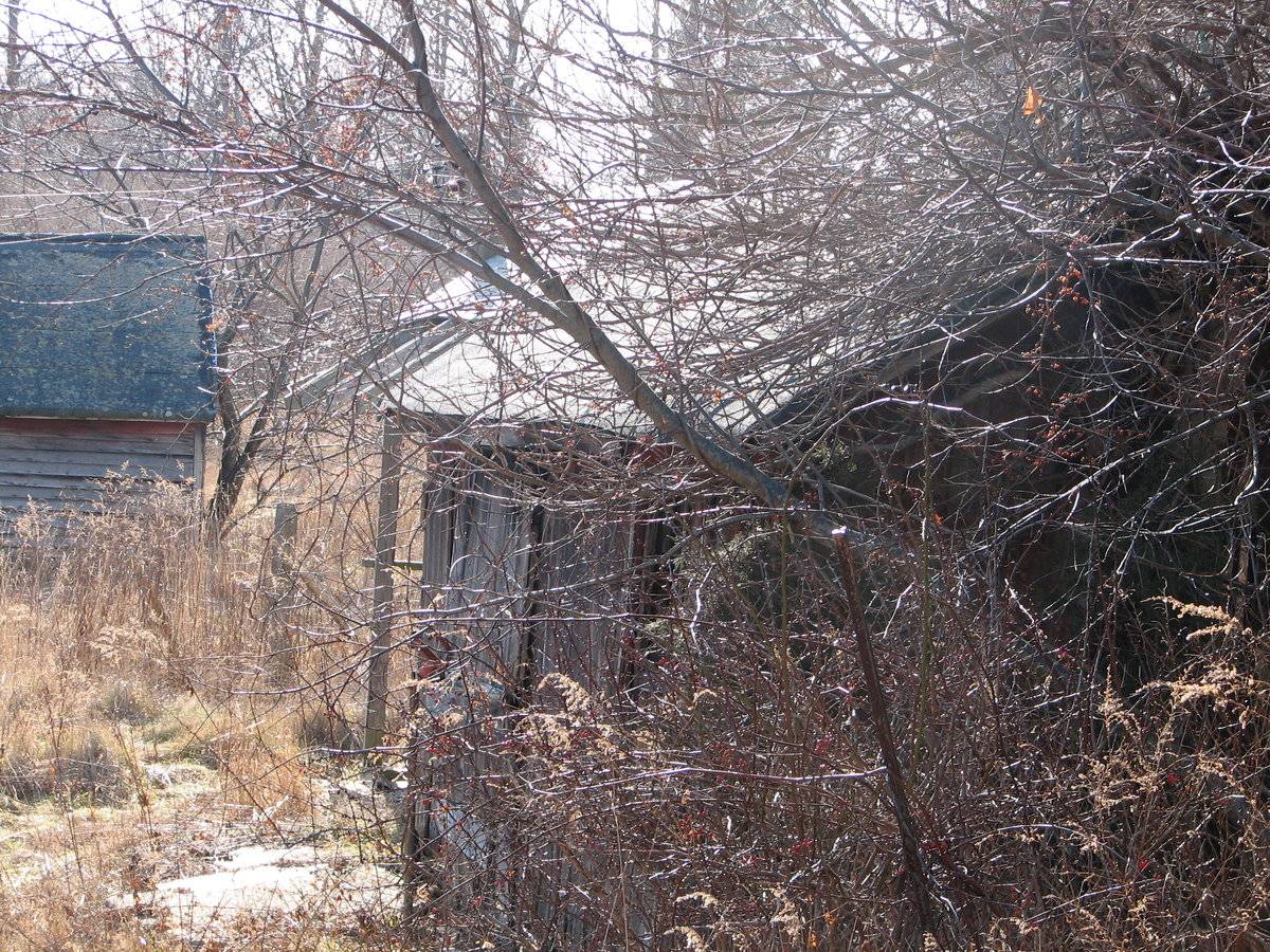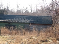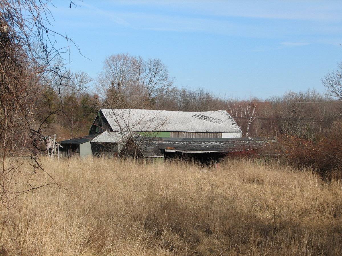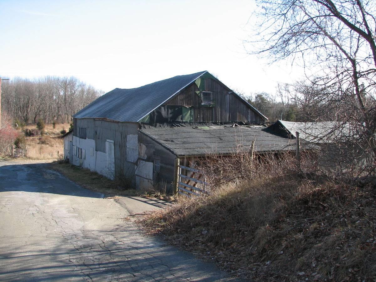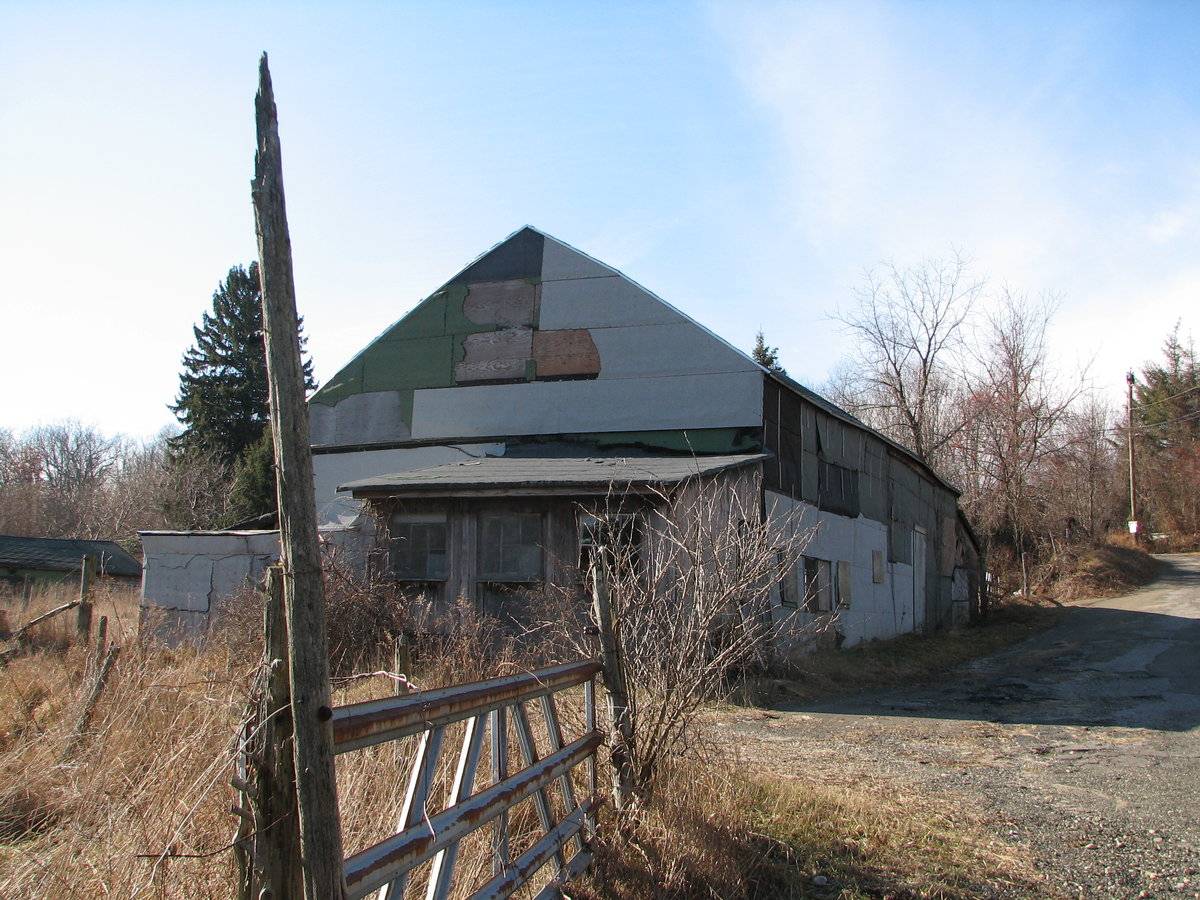 A barn complex. Abandoned/neglected. Adjacent to a house (built 1762) in the same condition. Set on a beautiful meadow. Clad in tar paper on road side. Additions in rear. Two separate barns/sheds in rear.