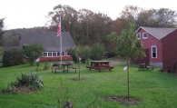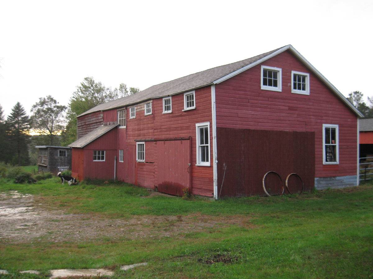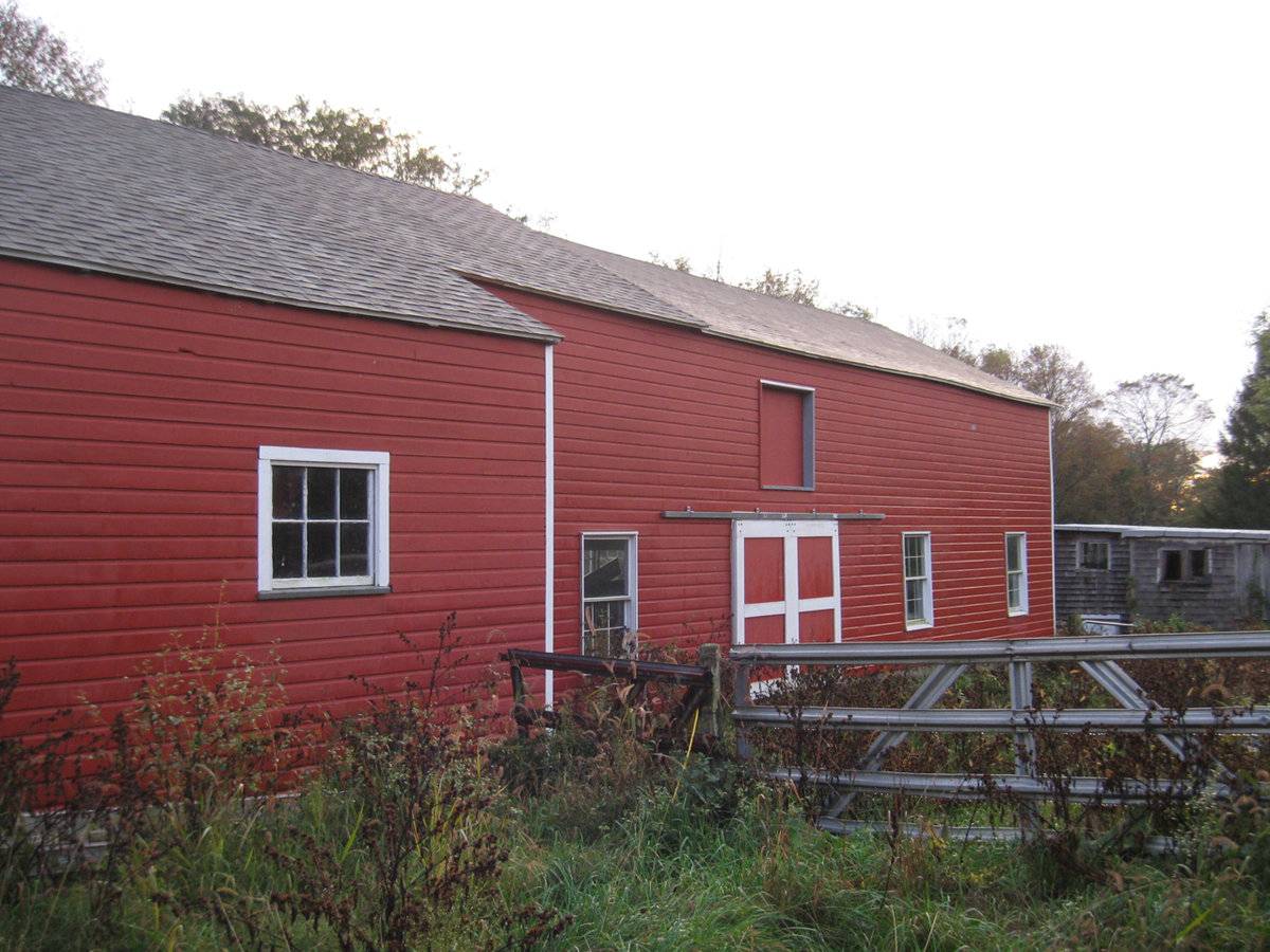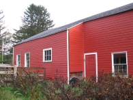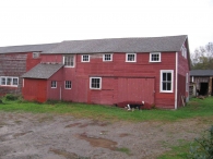 The east portion of the barn appears by the deflections in the roof line to consist of three bays. The left (west) bay is largely encompassed by the milk room addition but also had, prior to recent repairs, a small stable window at the ground level (replaced by a larger sash) and a large six-pane window at the loft level (removed). To the right the next bay has a hinged pass-through door and a six-pane stable window. The rightmost (eastern) bay has a sliding barn or garage door and to the right a two-over-two double-hung window matching those of the Farmhouse. The two righthand bays have at the loft level a row of four six-pane windows just under the eave line. Siding was formerly a mix of vertical boards on the milk room bay and horizontal lap siding on the right two bays. During rehabilitation horizontal siding is being installed across all three bays and the discontinuities that indicated construction of each bay as an addition, are now concealed by continuous siding.