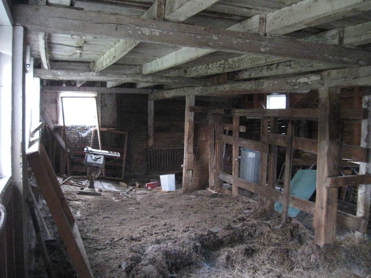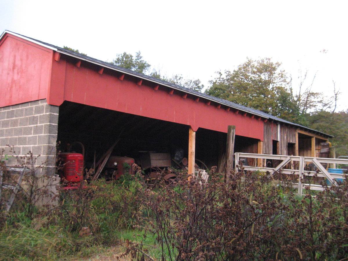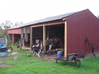 This is a 1 ½-story three-bay eave-entry English barn with several additional bays added to the east end, the easternmost being a school bus garage. The ground level of the western three-bay block has been adapted to use as a dairy cow stable, with the upper loft level remaining as a hay loft. The original frame is obscured on the interior but is visible from inside the hay loft.