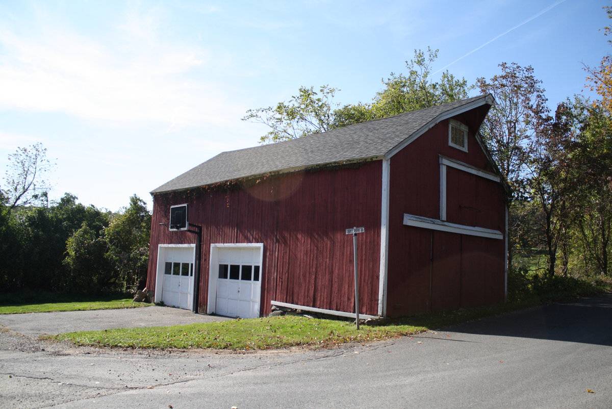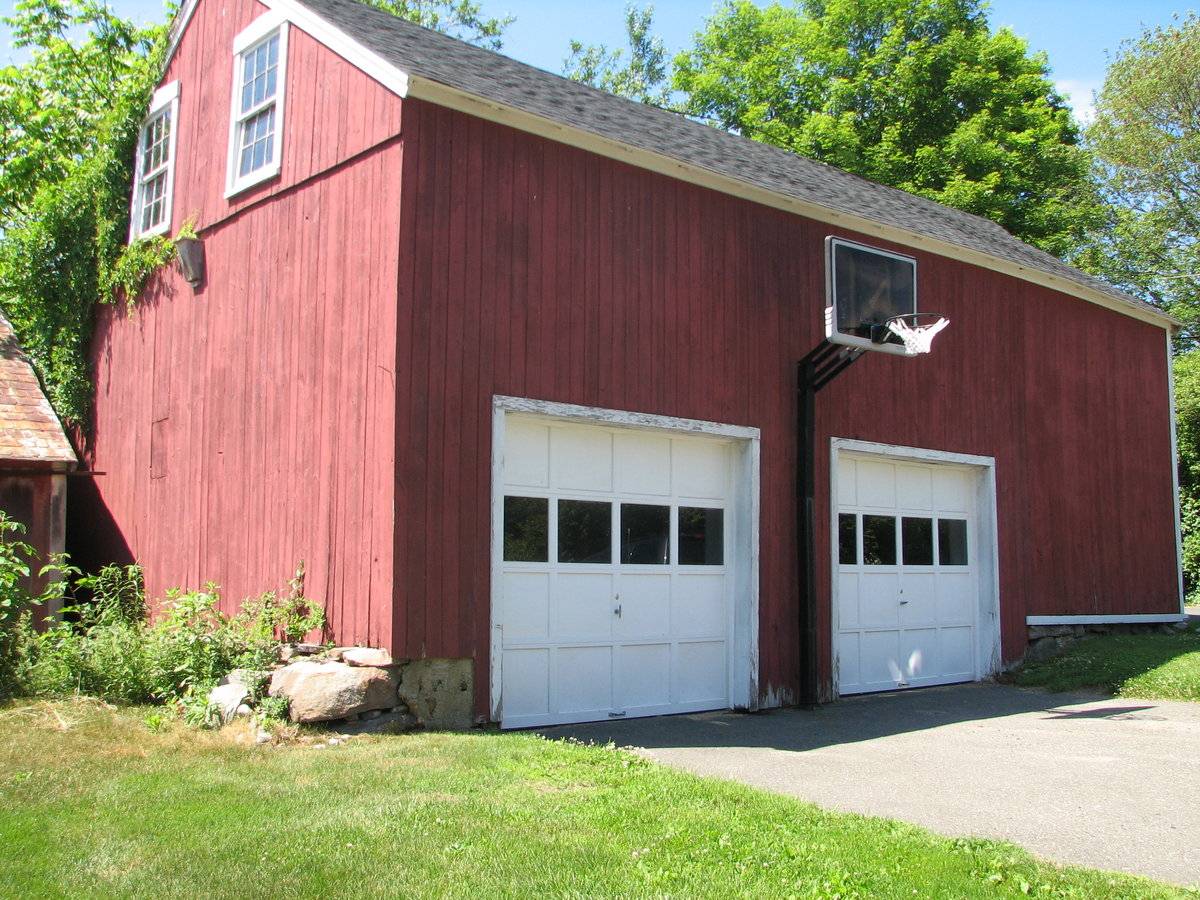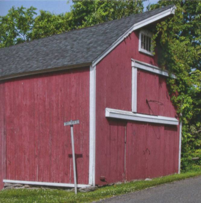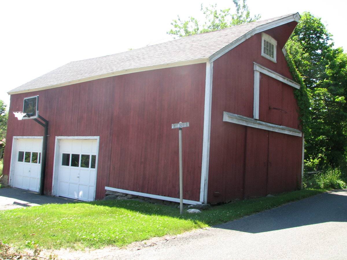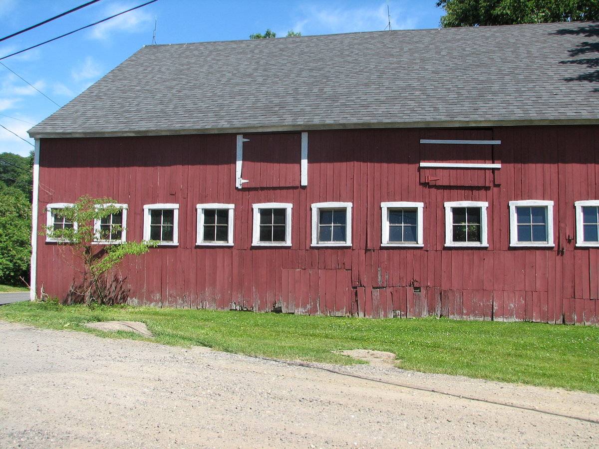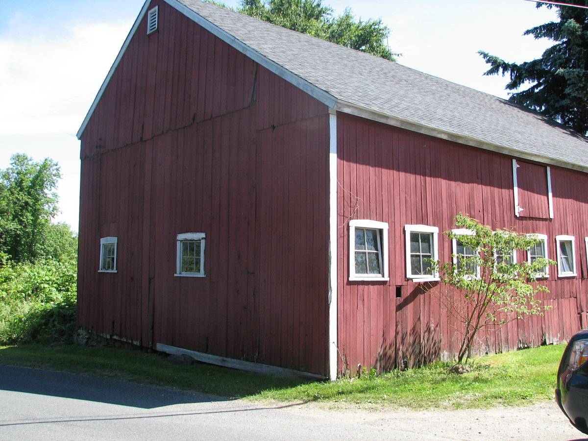The barn stands on the west side of Cross Brook Road, just to the north of a smaller barn. A third barn is across the road. The site is overgrown to the south and west. The house stands on the north side of Painter Hill Road. Features include: 32 x 20; peak-roofed barn stands with its gable ends to the northeast and southwest; primary elevation to east; two garage doors to south of center; fieldstone foundation; large corner stone at south gable; angled hood at north gable peak; loft door below; rolling doors at ground level; pair of 6-over-6 double-hung sash at south gable; ; concrete floor; vertical tongue-and-groove barn board, red paint with white trim.