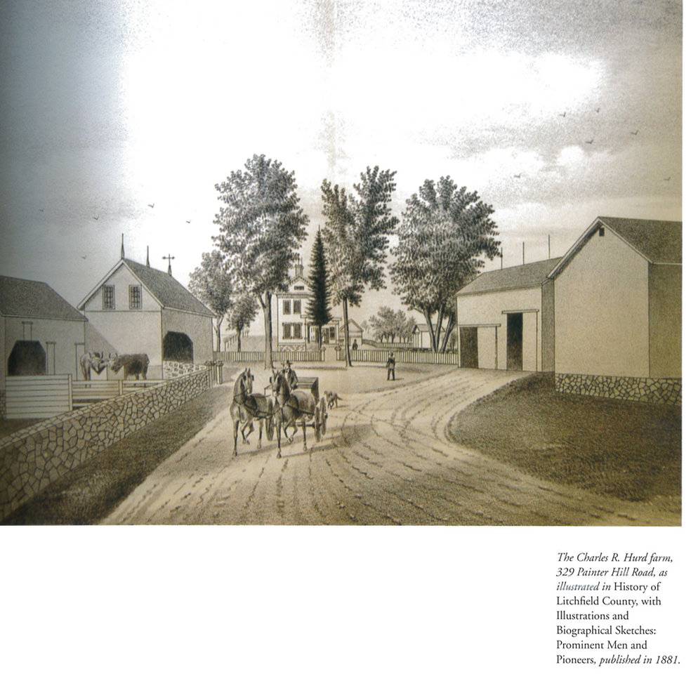 Information from survey of Roxbury by Rachel Carley. Charles R. Hurd (b. 1832) was the son of Jehiel Hurd, who lived at 314 Painter Hill. In 1855 Jehiel deeded his son 22 acres, and Charles built the fine Greek Revival house that still fronts the road at the intersection of Painter Hill and Cross Brook Roads. By the time Charles died around 1917 he owned 200 acres of farmland on both sides of the road. The farm was featured in an illustration published in the 1881 History of Litchfield County, Connecticut with Illustrations and Biographical Sketches; Prominent Men and Pioneers (see page 3).