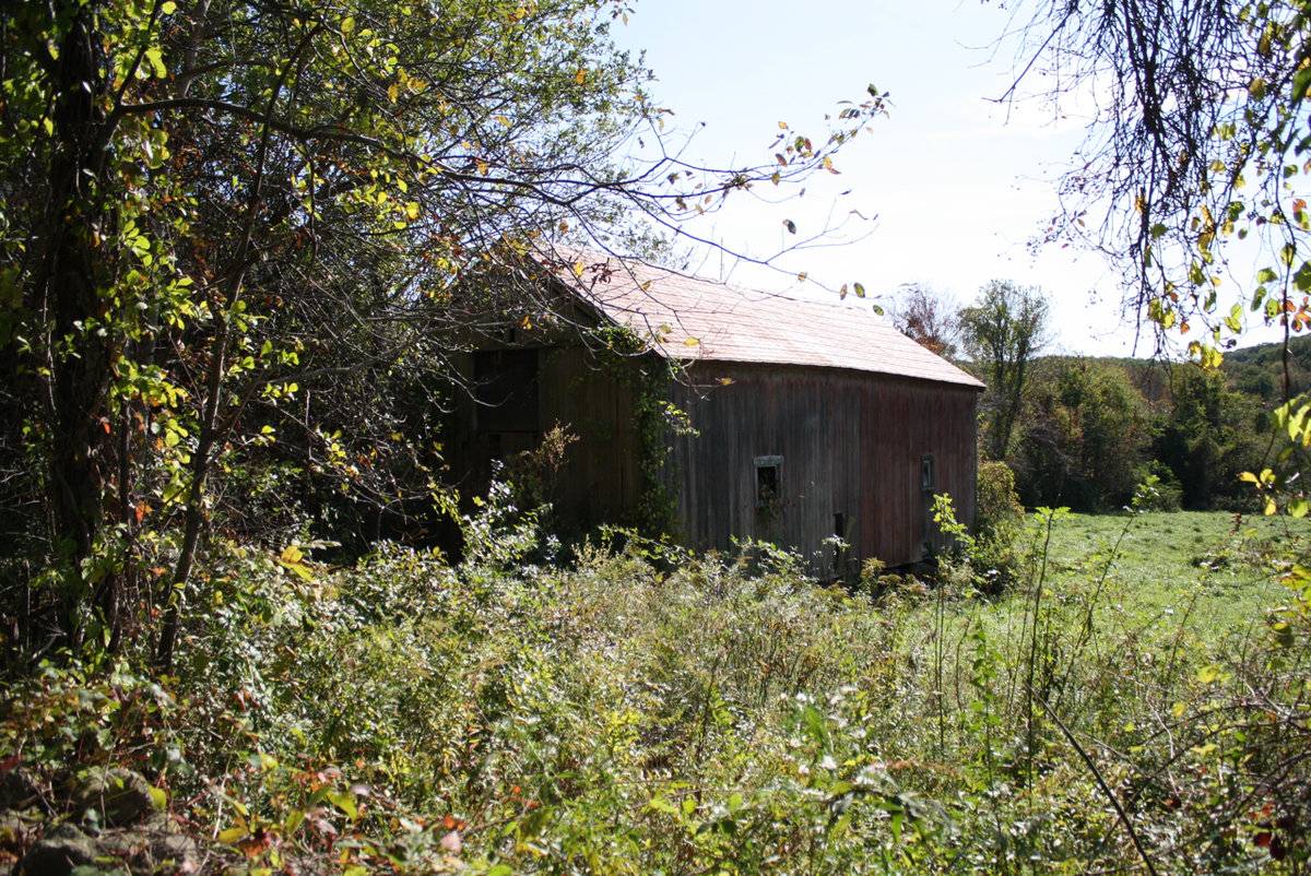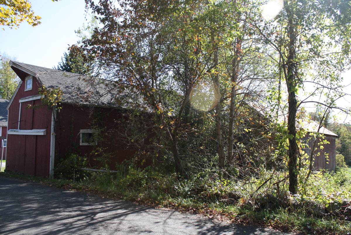 The small stalls and whitewashed interior of the timber-framed building suggest that it may have been used as a calf barn. A barn appears in this location in an illustration of the homestead published in the 1881 History of Litchfield County, Connecticut with Illustrations and Biographical Sketches; Prominent Men and Pioneers (see page 3). This structure appears to be that building, but with the roofline and façade altered. The pressed tin roof shingles probably date from the first decades of the 20th century. One of three barns on this site, this barn stands on the west side of Cross Brook Road, just to the south of a larger barn. A third barn is across the road. The site is overgrown to the south and west with the house on the north side of Painter Hill Road. Features include: 32 x 14; peak-roofed barn stands with its gable ends to the northeast and southwest; rolling doors on primary east elevation (mostly rotted away); embossed tin roof shingles; hewn post-and-beam frame; interior whitewashed; four board stalls at north end; vertical