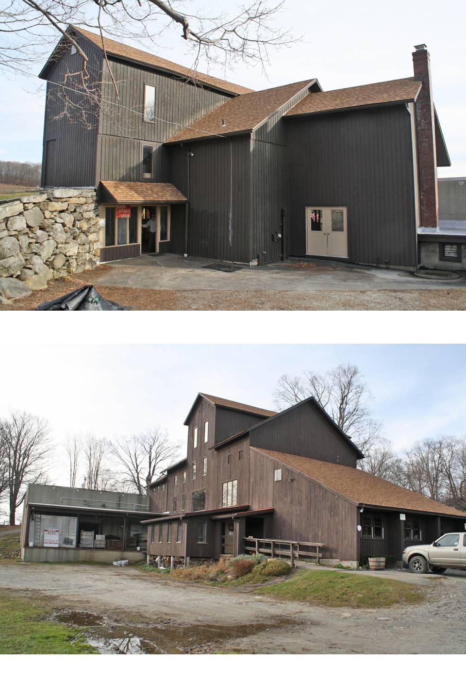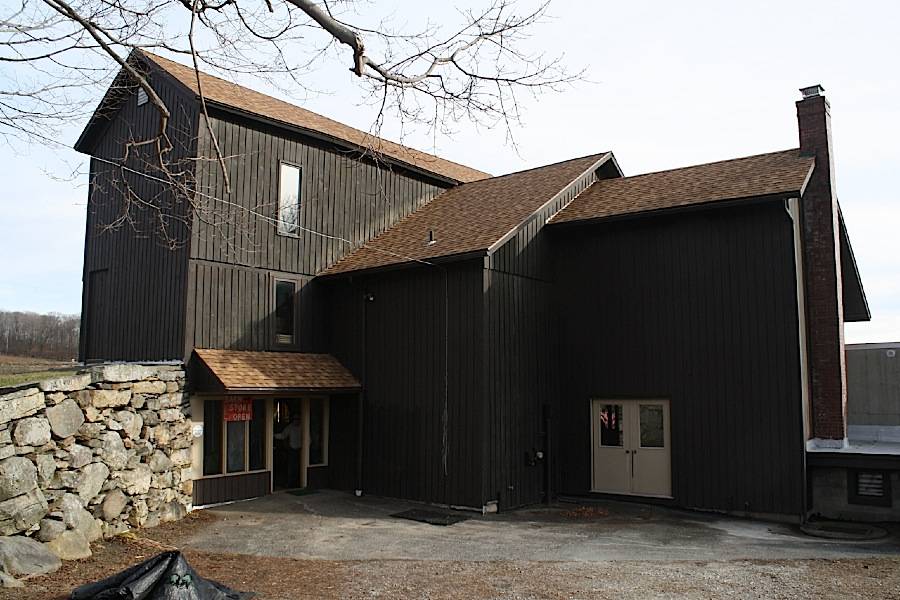 This is a 2 ½-story plus basement hybrid type barn, 30’ x 70’, with entries into various locations on its four levels. The gable roof has its main ridge-line oriented east-west perpendicular to Dunbar and Cornwall Bridge Roads. Siding is vertical boards stained dark brown. Windows are a mixture of casement and picture windows, installed in the early 1980s when the barn was remodeled for use as a store and office space. A large 47’ x 60’ apple storage warehouse with a flat roof is attached at the west gable-end and extends to the south of the barn footprint.