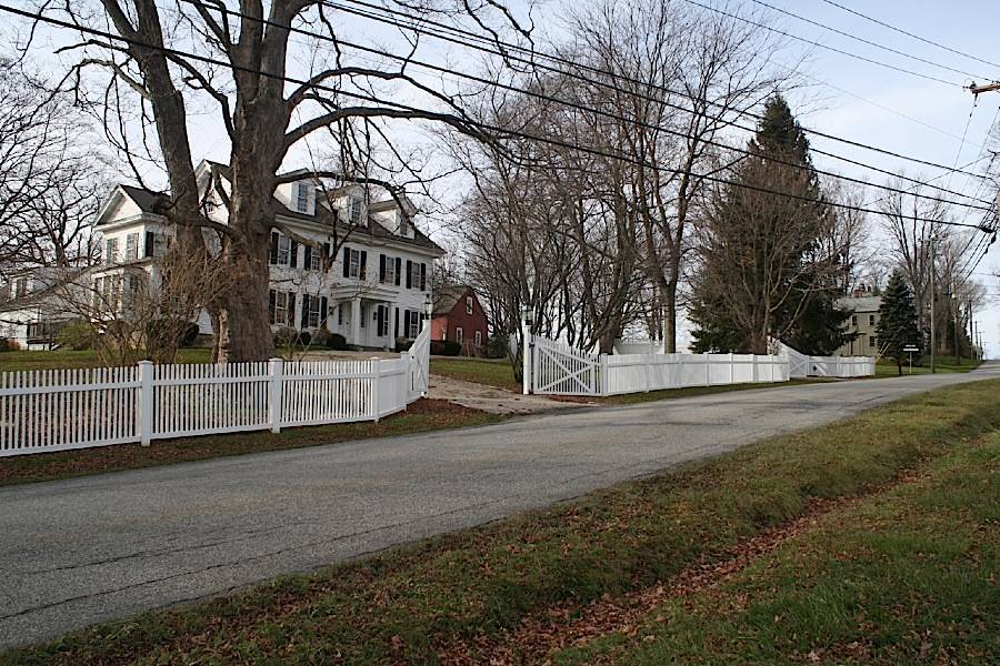 To the northwest, along the west side of Dunbar Road, a row of historic houses and a grange (originally a church) are remnants of the village of Ellsworth. 13 Dunbar Road, a 2 ½-story gable-roofed house whose date is given by the Assessor as 1866, was the Dunbar home, now under separate ownership. The house is a five-bay colonial-style structure with its east eave-side facing the road; the main entry is in the center bay under a columned porch. Three attic dormers project from the roof and a shallow wing projects south from the gable-end. The eaves and gable-ends have deep cornices with molded trim; windows are six-over-six double-hung. Approximately five miles northwest along Route 4 is the Sharon National Register Historic District in the town center on Route 41. Further northwest, the Sharon Valley National Register Historic District recognizes a 19th-century industrial village.