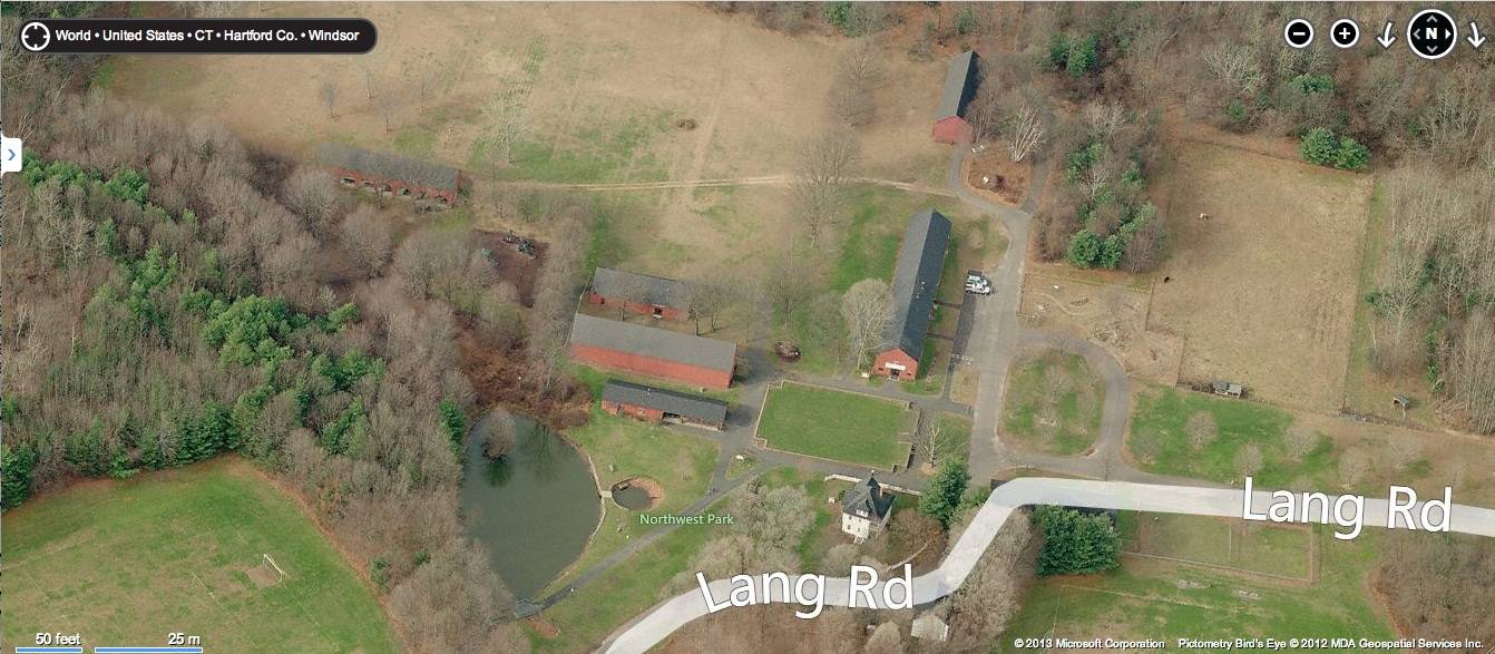 The village of Rainbow is located across the river to the northeast while Poquonock is situated along Poquonock Avenue (Rte 75) at a crossing of the Farmington just to the east of the park. Northwest Park is reached via Lang Road, which runs north from Prospect Hill Road, an east-west road that intersects Poquonock Avenue.