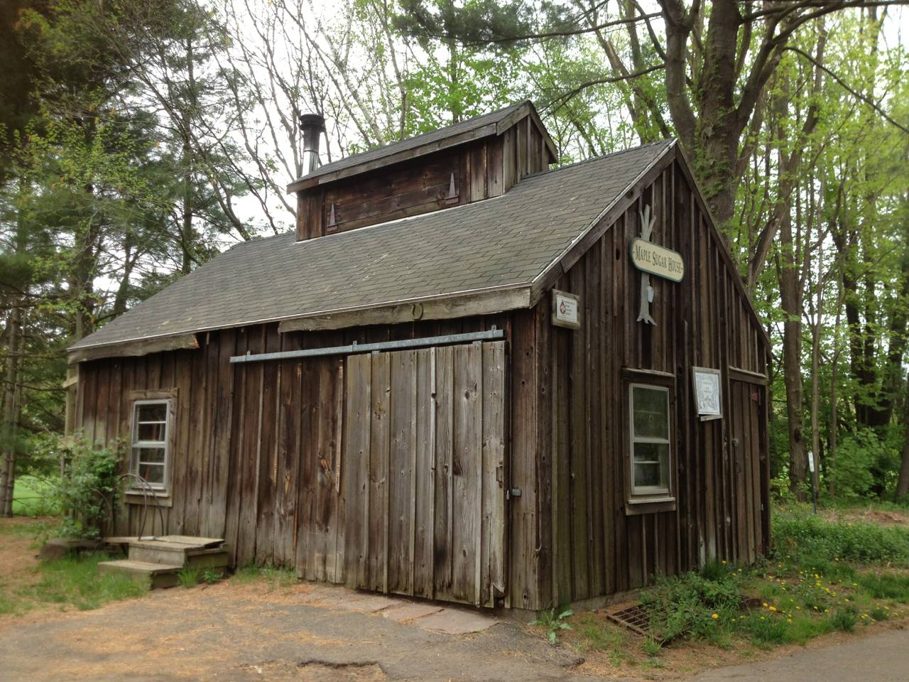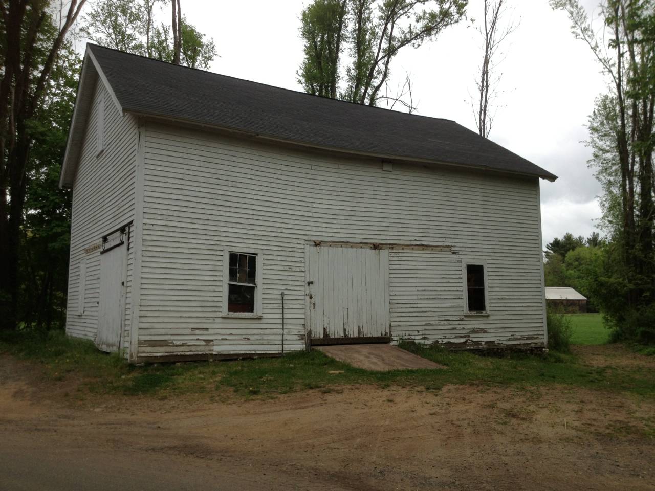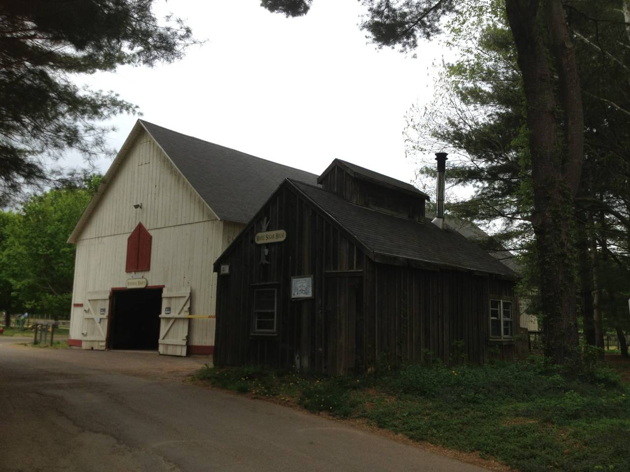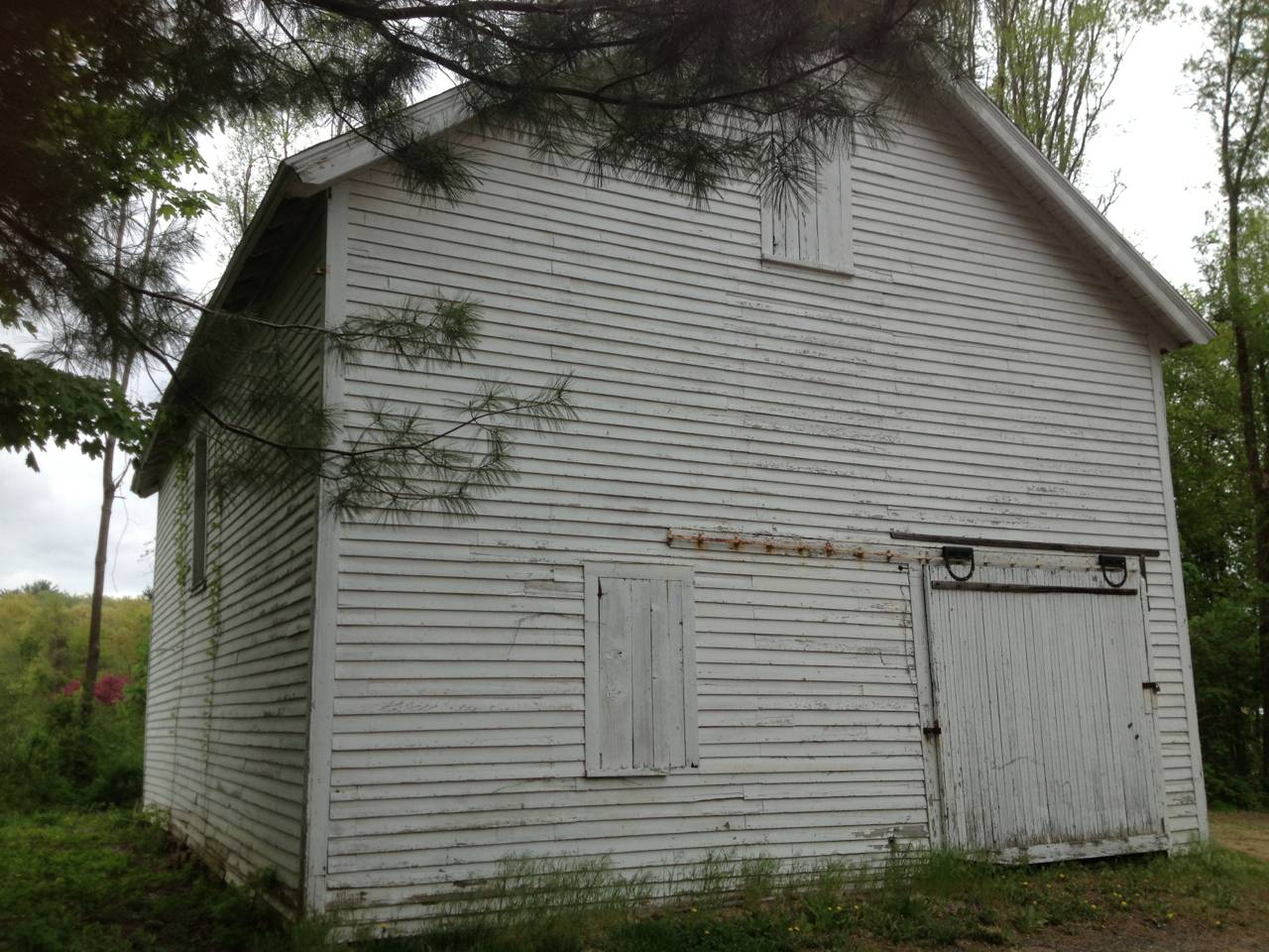 Northeast of the Farmhouse is an English barn which appears to have been a horse barn or carriage barn for the farm family. It is a 1 1/2-story three-bay gable-roofed structure with its ridge-line oriented east-west. A sliding door in the center bay of the south side is typical for an English barn. Another sliding door is off-center to the right (south) in the west gable-end. There is a pass-through door in the east gable-end and several window openings which appear to have had double-hung sash. Siding is wood clapboards with corner board trim, roofing is asphalt shingles, and the foundation is cobblestone masonry. To the southeast is a small low hip-roofed structure that appears to have been a springhouse. North of the Farmhouse and west of the English horse barn is the modern maple sugar house, a gableroofed