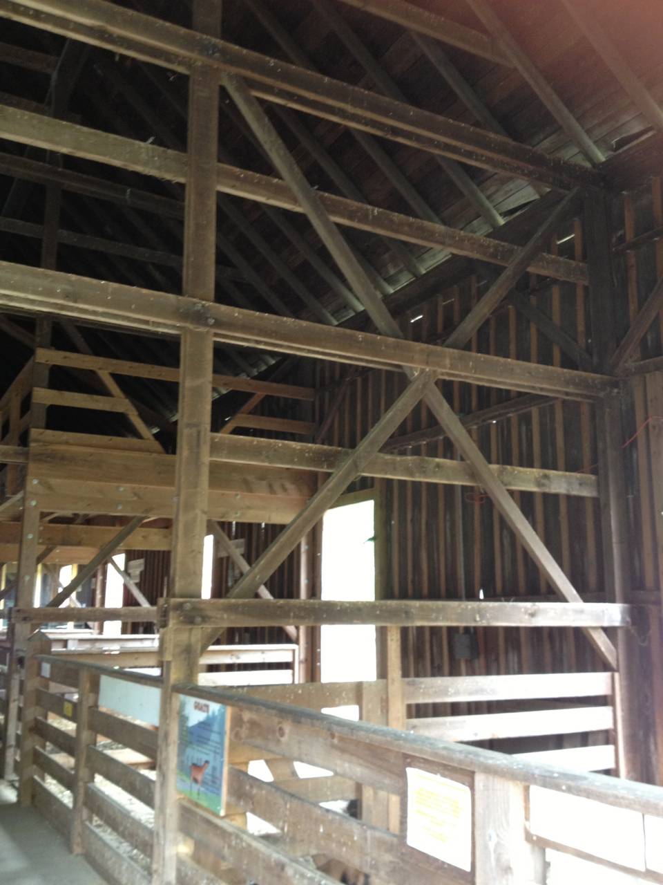 The interior is a typical early 20th-century type of timber frame structure with two interior posts at each bent and a network of tie-girts and diagonal braces of dimension lumber secured with bolted or nailed connections. The multiple horizontal ties also function as supports for the rails upon which the tobacco leaves were hung to cure.