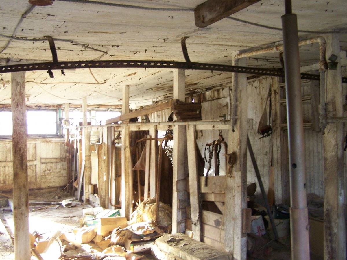 There appears to be a pass-through door at the north corner of the east side of the shed-roof addition. The original roof level of the shed-roof addition is visible on east gable-end, however an alteration was made from the second gambrel pitch to a straight extension to the north wall of the addition. On the east gable-end of Barn I is a single sliding barn door, located just south of center, which slides to the north and is mounted on an exterior track. There may have once been a hay door on an upper level since the gambrel roof extends out at the center.