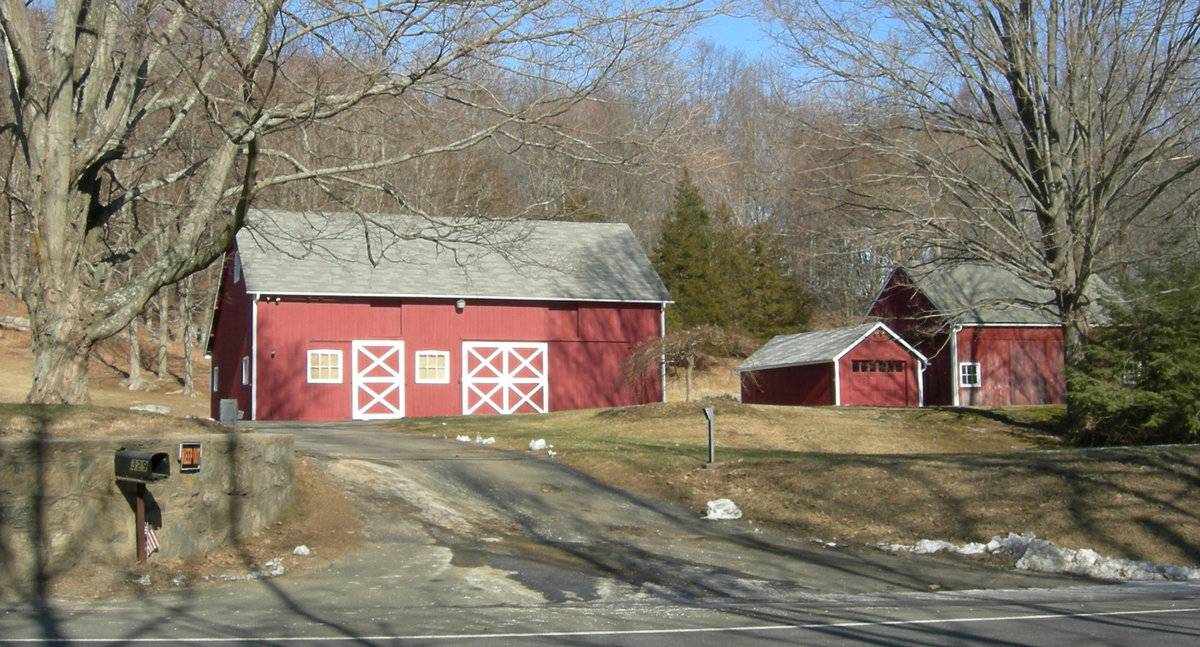 The second barn is a 1 ½-story, tripartite, eave entry barn. The main façade faces south and the ridge-line is also parallel to Berkshire Road. The main entry is a pair of exterior, double-height doors situated nearly in the middle of the façade. The wide track covers most of the south eave-façade up to the fixed, six-pane windows at the far ends of the lower story. The gable attic of the west, gable-side of the second barn is blank. The barn has vertical flush-board siding which is painted red with white trim around the windows, the corner edges and the rakes. The roof is covered with asphalt shingles.