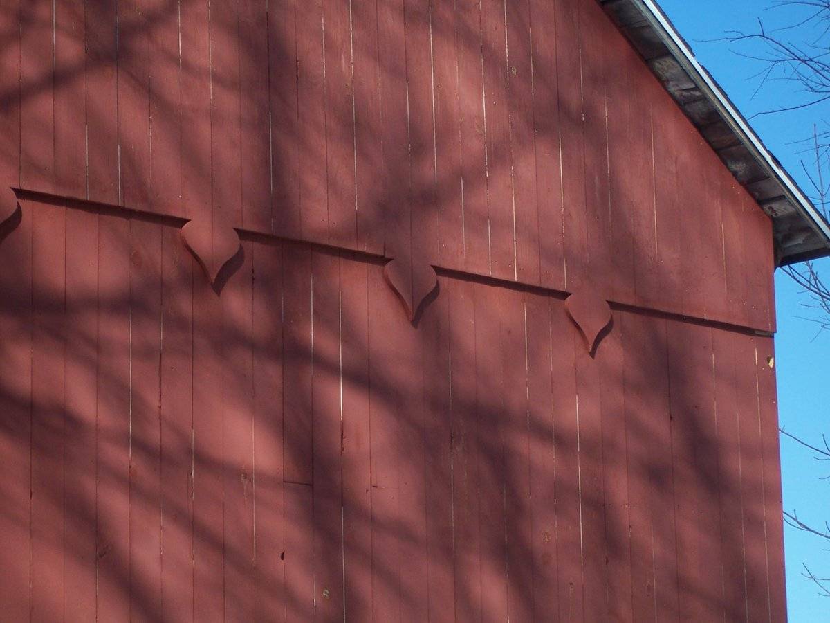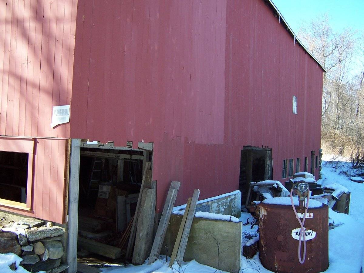 This is a 1 1/2-story eave-entry bank barn. The main facade faces west and the ridge-line of the barn is perpendicular to this portion of Old Turnpike Road, which runs approximately east-west. The main entry is a pair of double-height, hooded, exterior sliding doors in the middle bay of the original structure. A fourth bay was added to the south gable-end. The north bay of the west eave-facade is blank. The south bay of the original structure has a centered six-pane window. The additional bay has a smaller, centered exterior sliding door. The track extends past the gable-end to the south. The grade at the south gable-end of the barn declines slightly to the east, revealing a partial basement level. The partial basement level of the south gable-end of the barn has a window opening towards the east corner and a basement window off to the west. The rest of the south gable-end appears blank except for a vent just beneath the apex of the roof and a series of upside-down spade motifs along the dropped girt line siding divide. The grade at the east eave-side of the barn declines further, revealing a full basement level. A mortared stone retaining wall extends to the south at the southeast corner. There are two open door spaces on the basement level of the east eave-side of the barn in the south half. There is a series of five windows with a pass-through door towards the north corner in the basement level of the east eave-side of the barn. The main level of the barn is blank except a nine-pane window centered in the middle bay of the original structure. The north gable-end of the barn is blank except for a vent centered beneath the apex of the roof and a smaller vent just below it and to the west. The girt line siding divide is straight; there are no motifs. The barn has vertical flush-board siding painted red. The roof has a projecting overhang and exposed rafter tails. It is covered with asphalt shingles. The foundation is mortared field-stone.