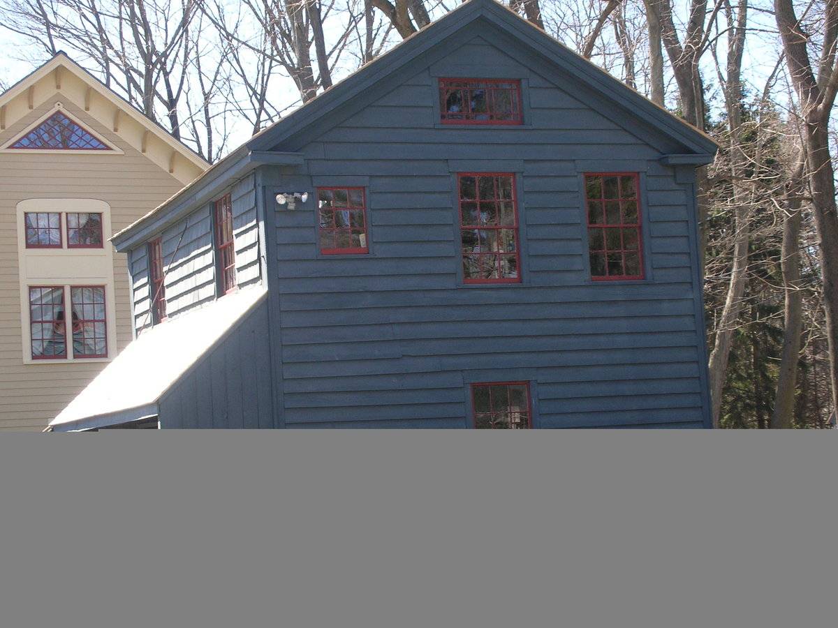 Blue/Grey Barn with clapboard and shingle siding, asphalt roof. Located in Guilford Town Center Historic District, and appears to be a contributing resource within the district.