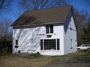 white vertical siding on barn with an Asphalt roof Located in Guilford Town Center Historic District, and appears to be a contributing resource within the district.