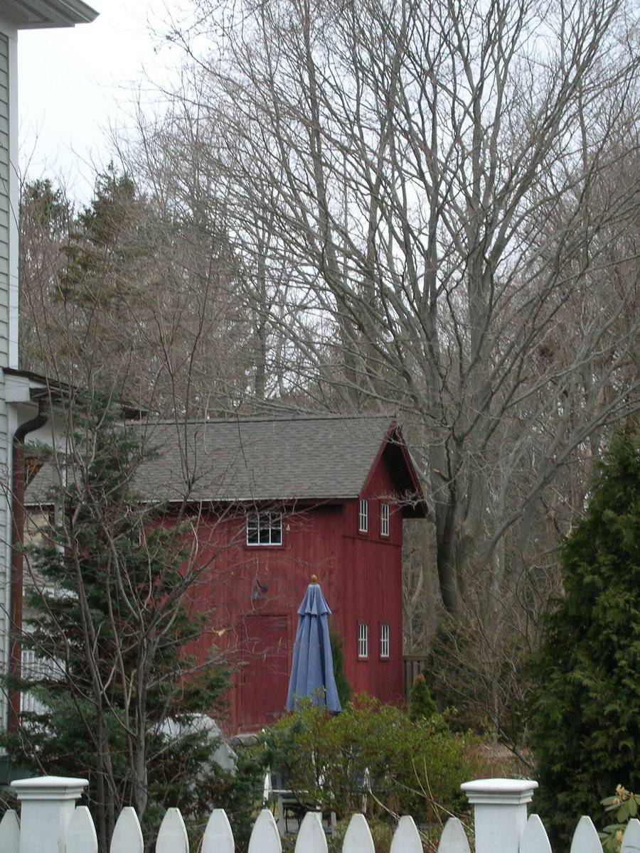 320 sq. ft. Red barn with Vertical siding and an asphalt gable roof Located in Guilford Town Center Historic District, and appears to be a contributing resource within the district.