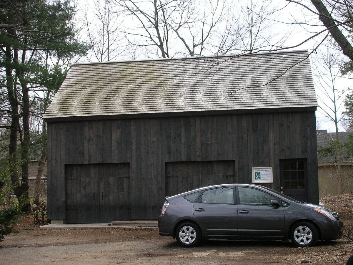 684 sq.ft. Raw wood Vertical sided barn with wood shingled roof Built in 2005 Located in Guilford Town Center Historic District, but is not a contributing resource within the district.